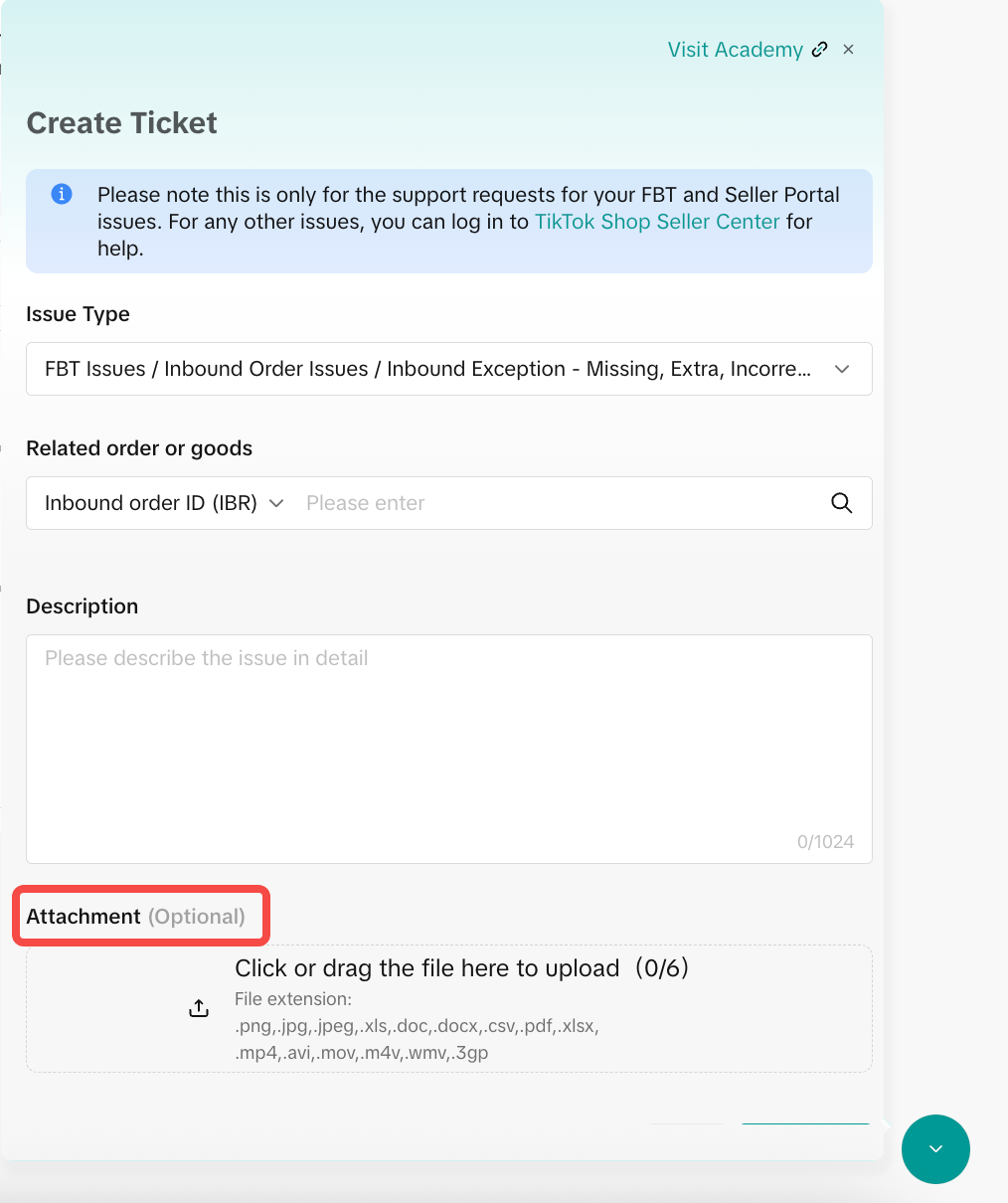 | Product Inbound 入库 | Inventory Lost and/or Damaged 库存丢失和/或损坏 | 入库相关问题,如IBR中的货物丢失或损坏 | FBT Issues > Inbound Order Issues > Inbound Exception – Missing, Extra, Incorrect Units | IBR#(入库单号) | – Goods ID – 差异数量 | 1. 英文商业发票 2. 货运单据:货运提单(Bill of Lading)或快递配送凭证(POD) | TikTok客服团队将在24小时内响应并处理大部分常规报销工单。对于复杂问题及库存相关报销(包括入库、在库库存及退库等),处理周期将延长至7-21个工作日。 | – 商家可以通过FBT系统右上角的问号图标进入 工单中心,查看所有FBT工单进度 – 对于已批准的报销,商家可在报销后15个工作日内,在FBT系统Billing center > Billing details板块查询所有报销记录 | 若TikTok客服不同意卖家请求,且卖家对TikTok客服判定结果有异议,可补充证据再次申诉,TikTok客服将根据卖家新提交的证据复核处理。 或请联系您的FBT经理确认 |