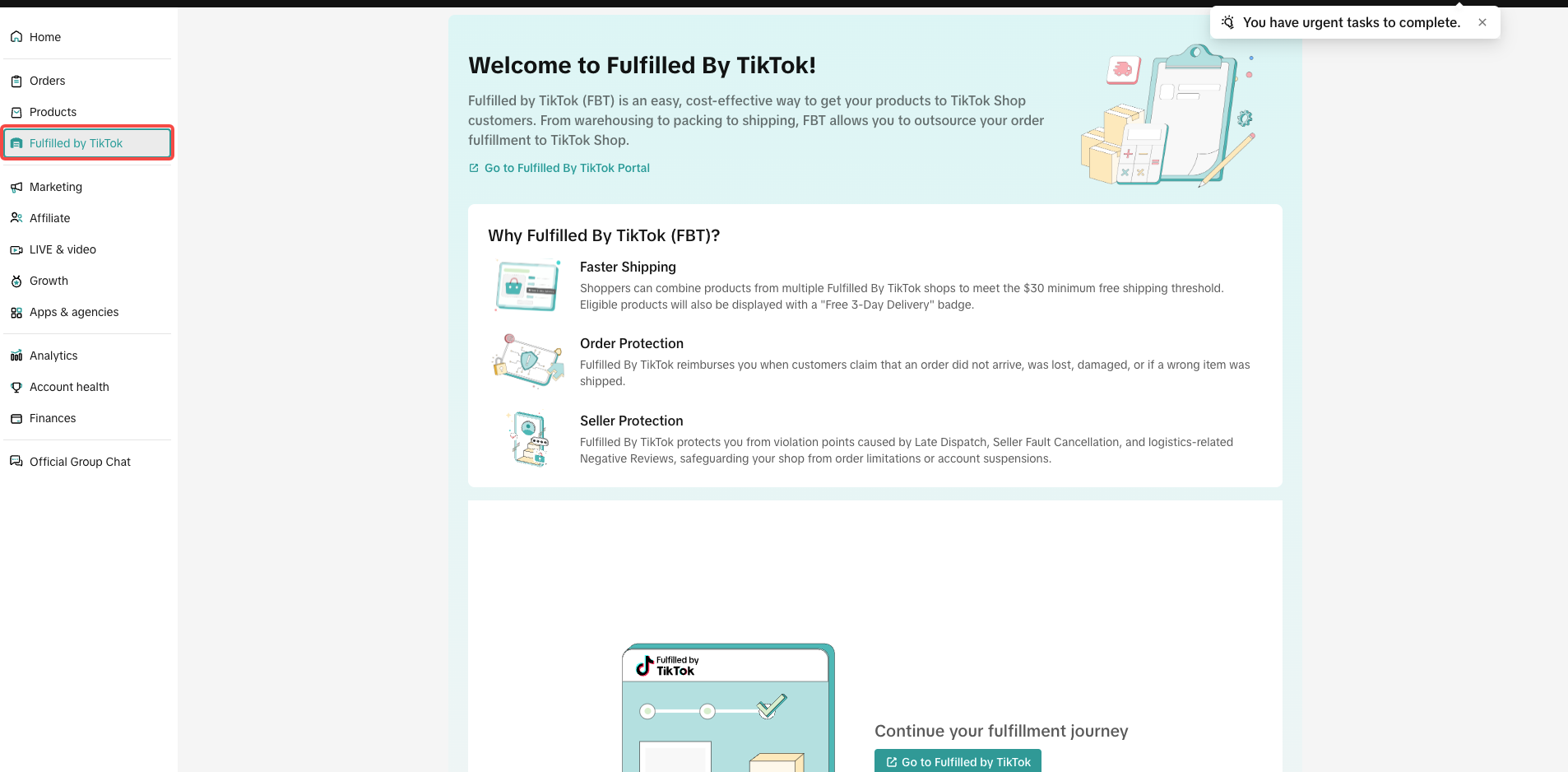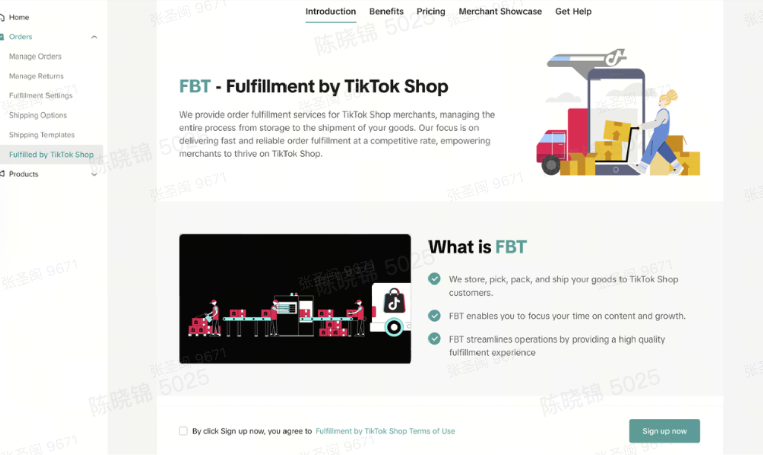 | 登录Seller Center,点击Order- Fulfilled by TikTokShop, 跳转FBT | 1. 必须使用Seller Center主账号登录: 1. ACCU商家列表选择“Fulfilled by TikTok”; 2. CCCU商家列表选择“Orders”->“Fulfilled by TikTok” 如果看不到Fulfilled by TikToKShop选项,退出后重新登录 2. 跳转FBT后,勾选同意授权框,点击sign up now | ![]() ![]() ![]() ![]() |