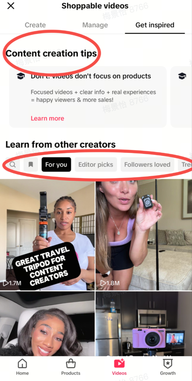 | 入口 1 | TTS创作者中心 -> 视频(第三个标签) -> 获取灵感 | ![]() ![]() | 步骤1 | 发现爆款短视频 – 支持按以下类别筛选表现最佳的视频 – Favorite 收藏(旗帜图标):您自己保存的视频 – For you为您:根据您浏览、下单或添加到展示柜的产品类别推荐视频 – Followers loved粉丝喜爱:根据你的粉丝浏览或订购过的产品类别推荐视频 – Trending in热门趋势:基于所选类别中GMV/订单增长的推荐视频 | ![]() ![]() |