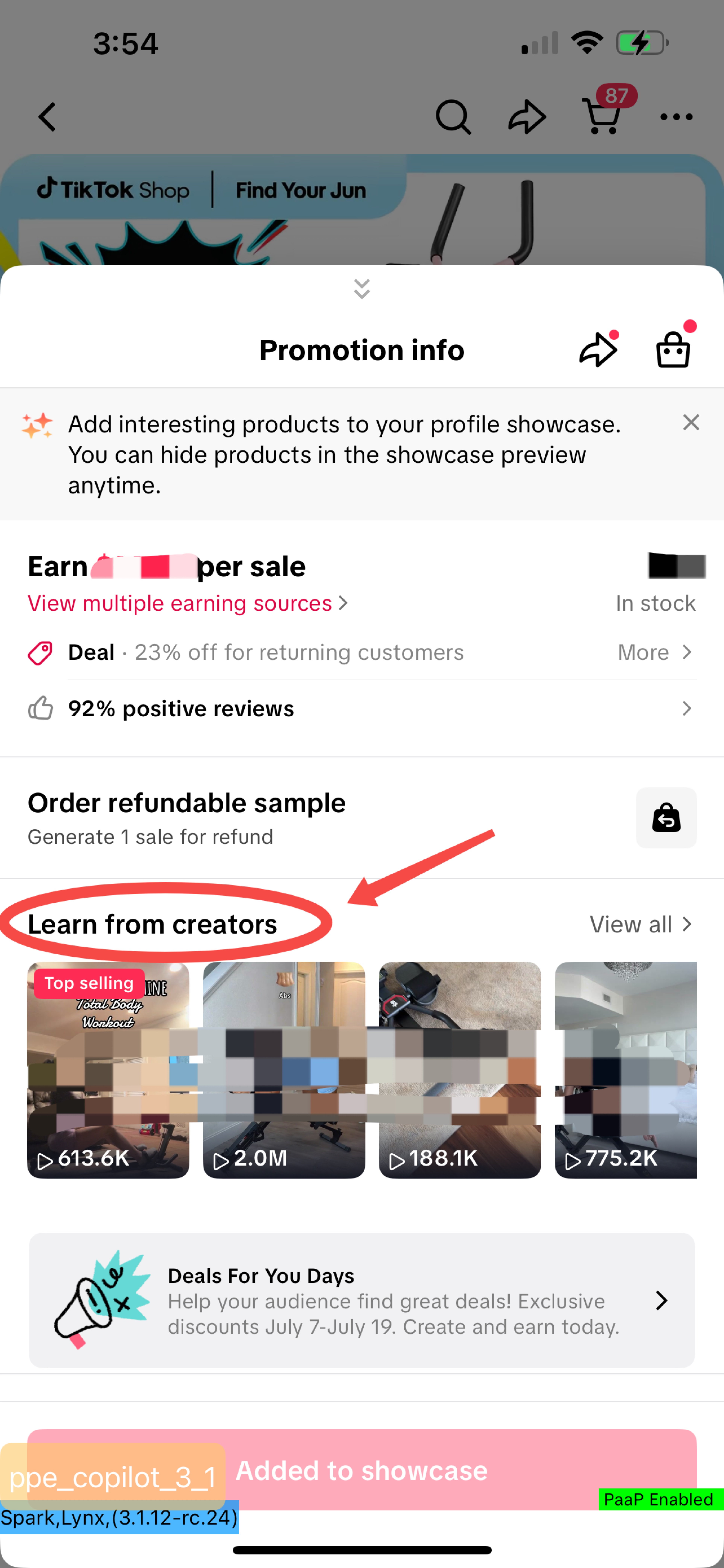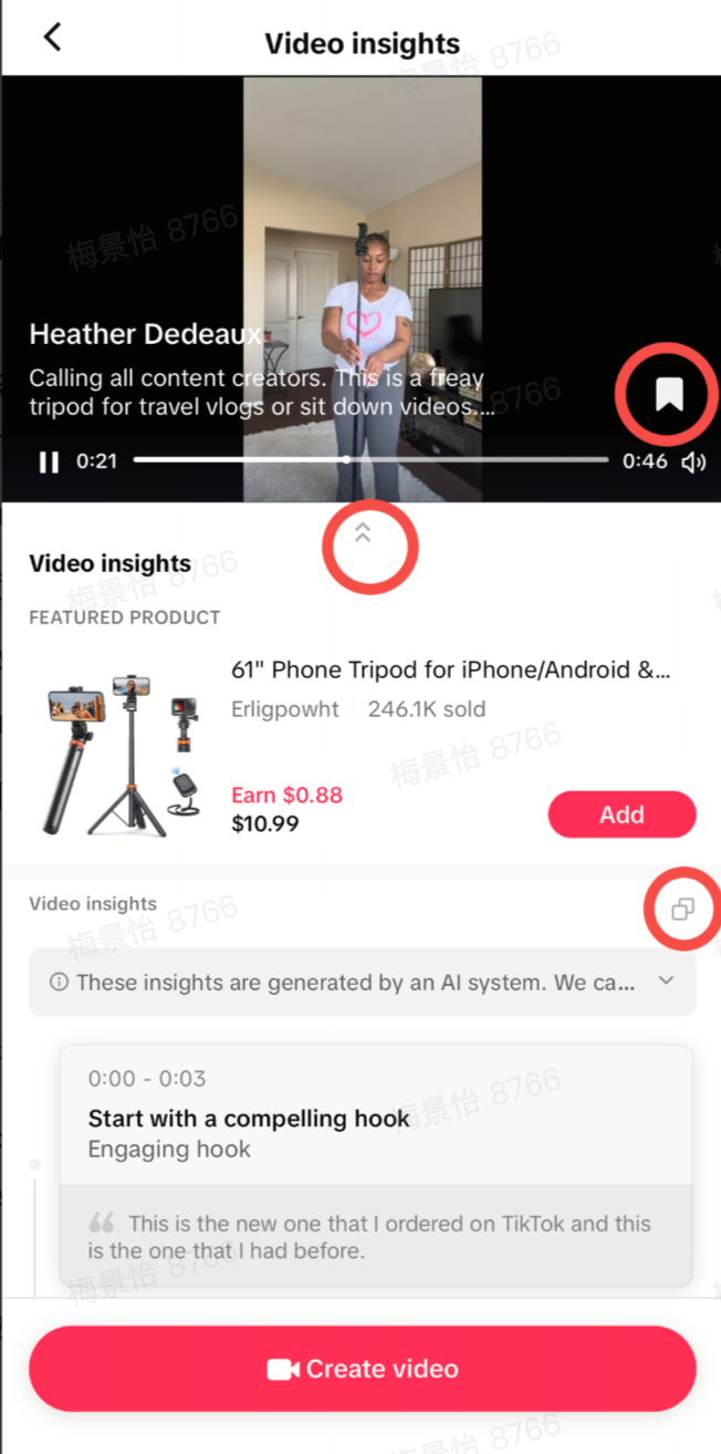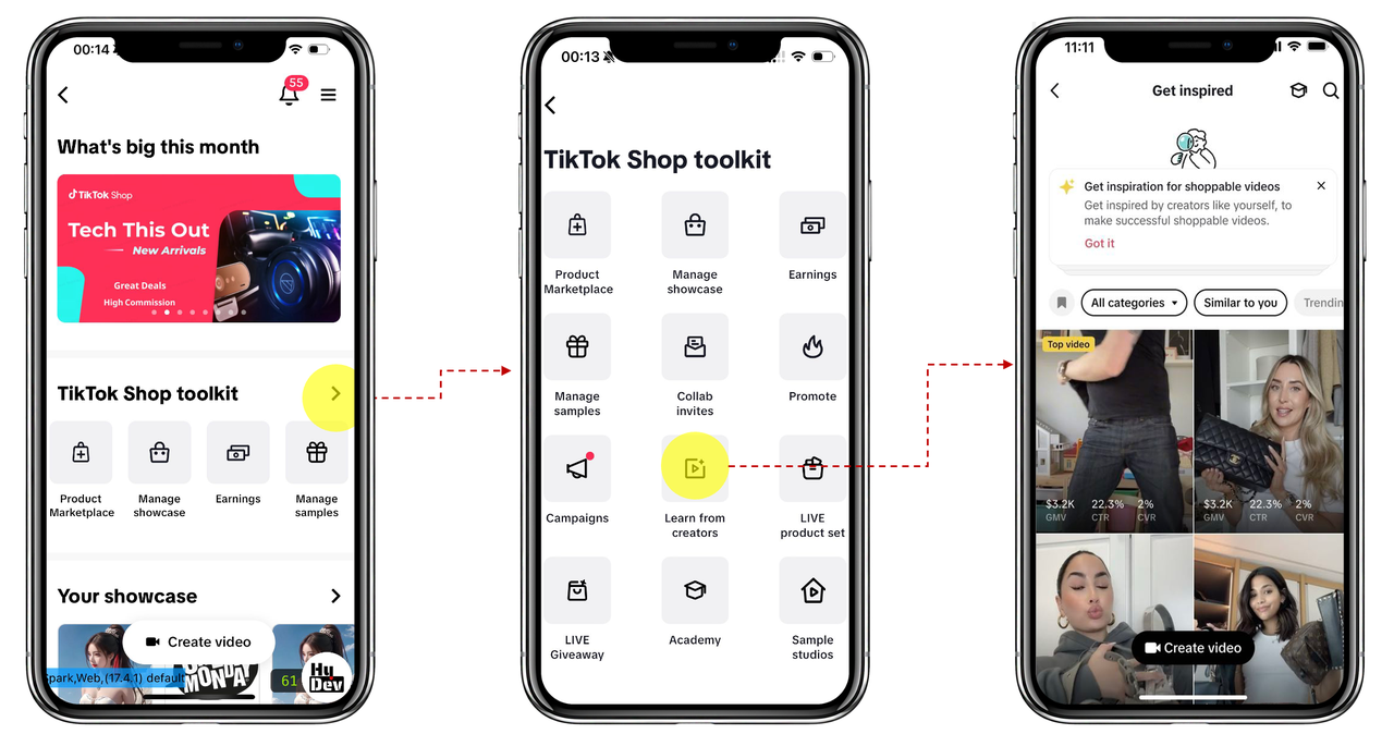 | 入口2 | TTS创作者中心 -> TTS工具包 -> 向创作者学习 | ![]() ![]() | 步骤2 | 洞察视频灵感(video insights) – 选择你想了解的视频,然后点击展开(双箭头图标)展开视频洞察 – 保存:点击旗帜图标保存视频,以便日后参考。 – 特色产品:点击添加按钮,可直接将视频展示的产品添加到您的展示区。 – 技能:视频中使用的经AI分析并推荐的技能,每项都配有时间戳。 – 视频数据:视频的关键性能数据,包括观看量、点赞数、评论数和分享数,供您参考和对标。 | ![]() ![]() |