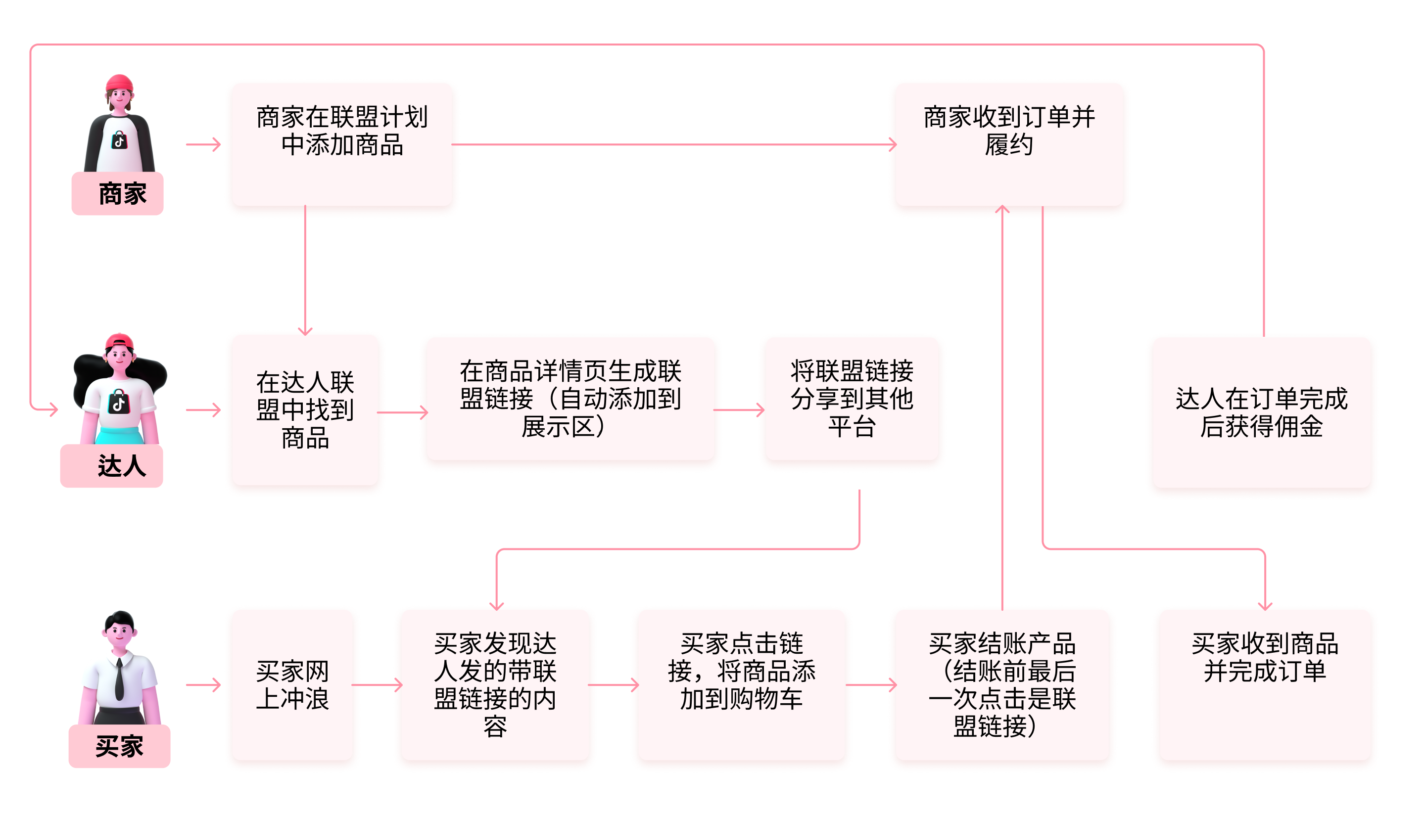 - 当买家点击链接并结账购买产品时,达人或外部流量服务商将从您这里获得佣金。他们将在订单完全完成后收到佣金。以下是运作方式: