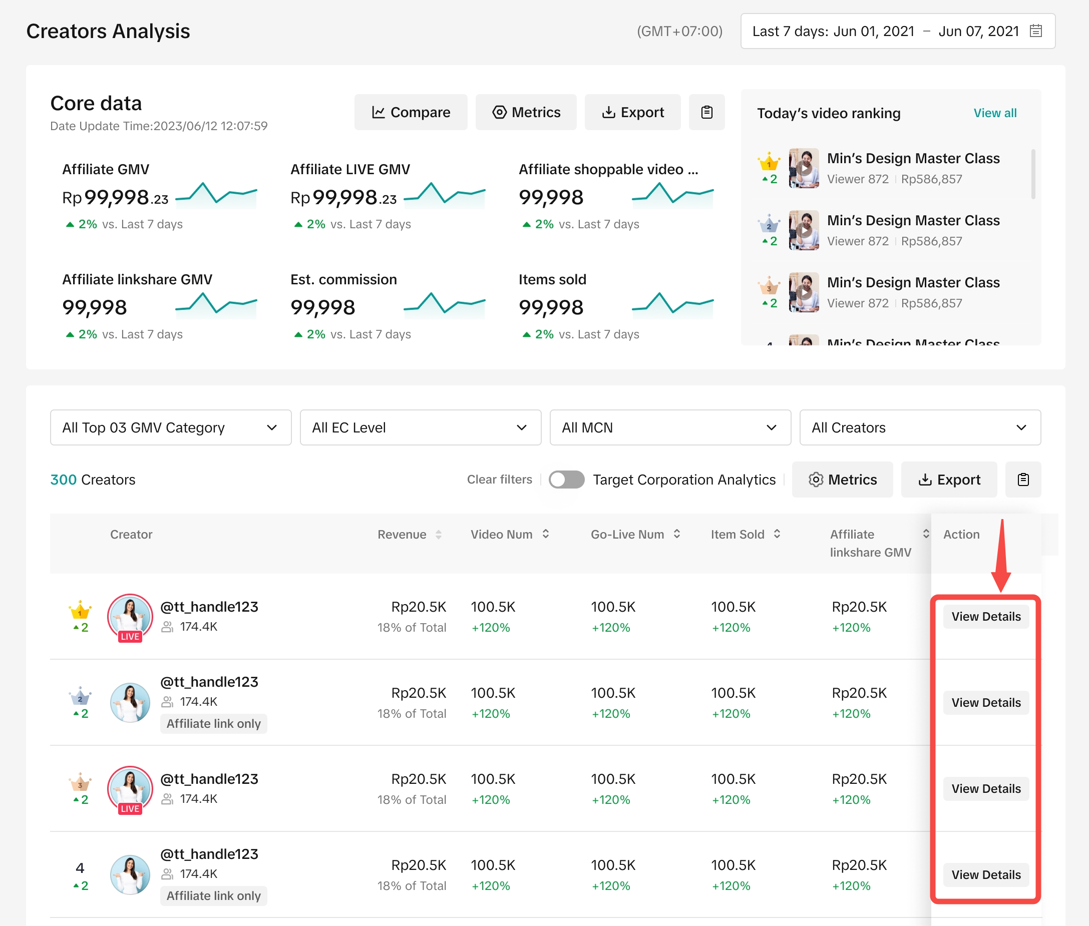 提示:尝试分析几个达人,看看是否有相似的趋势,即同一产品在这些达人中驱动了高 GMV 和预估佣金。了解这一点后,您可以鼓励其他达人推广该高效能产品的联盟链接!达人可以赚取更多佣金,而您则能获得更多 GMV。
