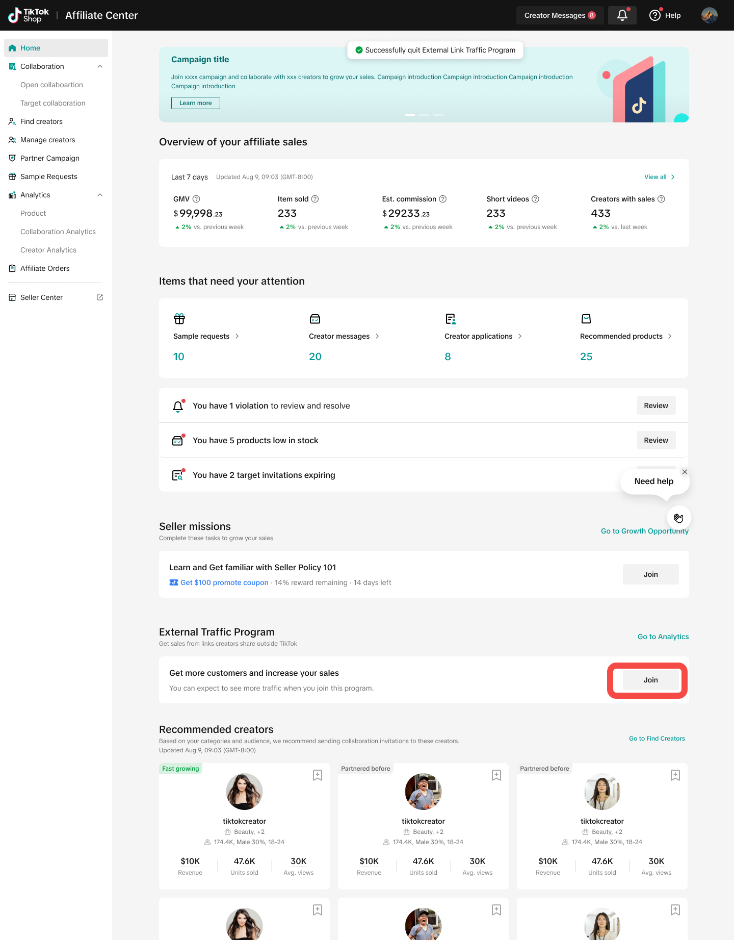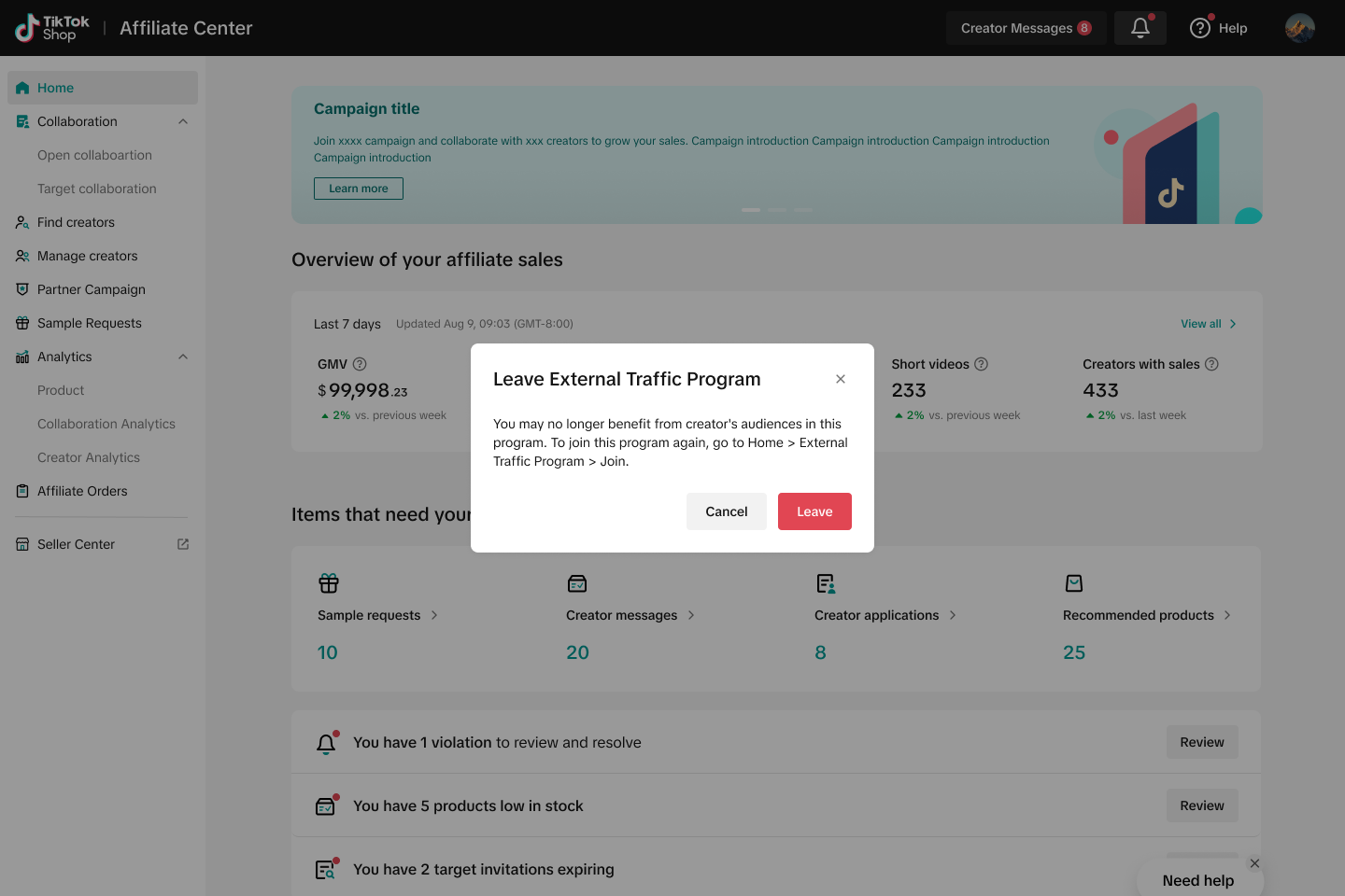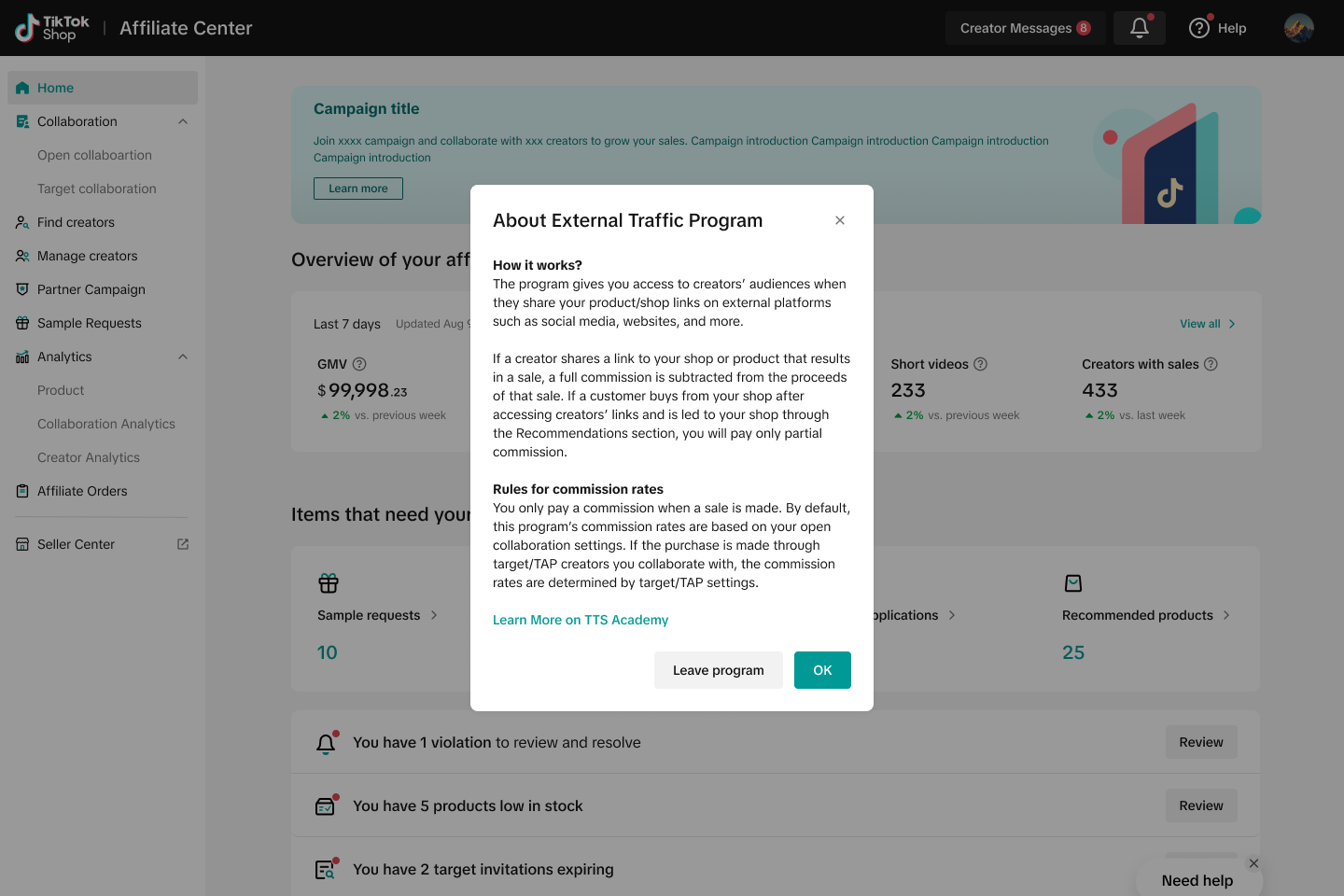 重要提示:达人或外部流量服务商仍然会从您退出计划之前产生的订单中赚取佣金。退出后,产生的订单将不再符合佣金资格。