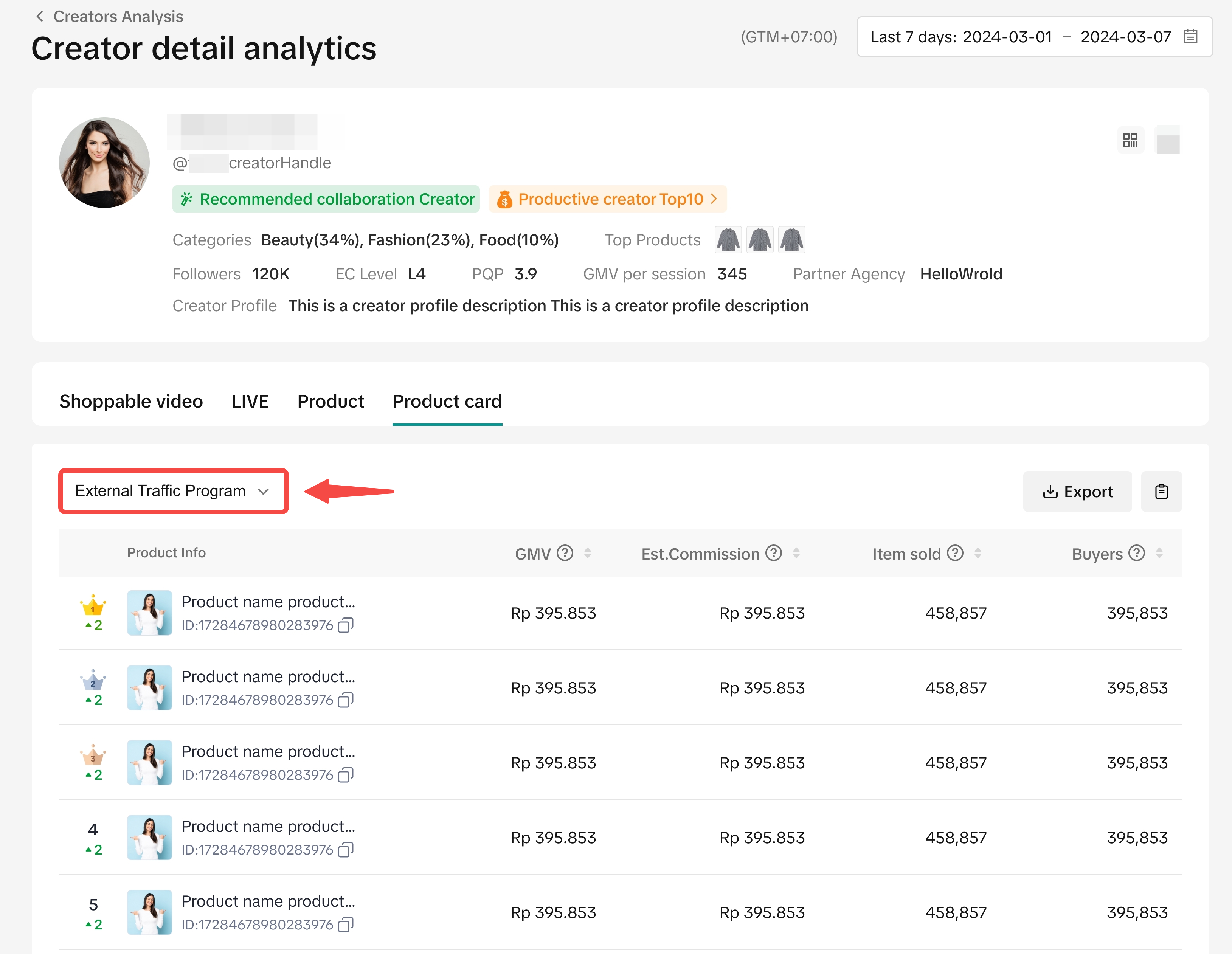 在“产品卡片”标签中,从下拉菜单中选择“外部流量计划”,以深入了解每个达人分享的联盟链接产品的进一步表现数据(如收入、售出商品、买家和预估佣金)。