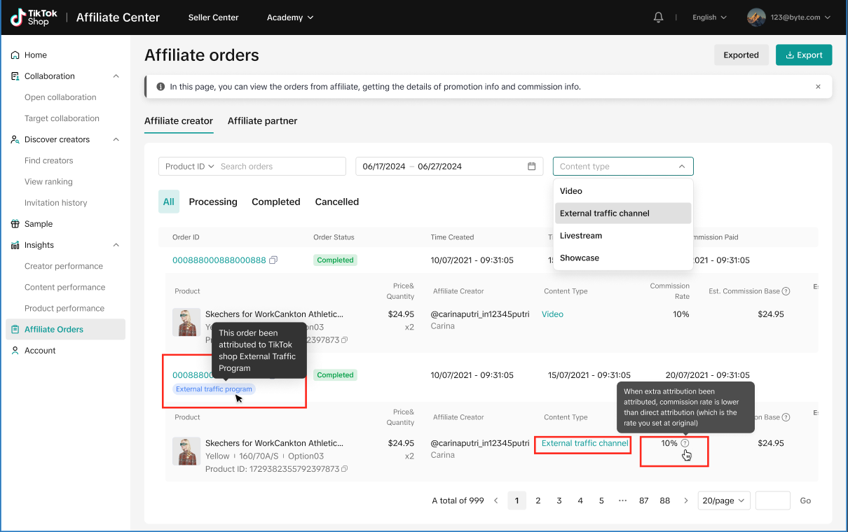 在此页面,您可以查看所有的联盟订单。要筛选来自外部流量计划的订单,请使用“内容类型”筛选器并选择“外部流量渠道”。