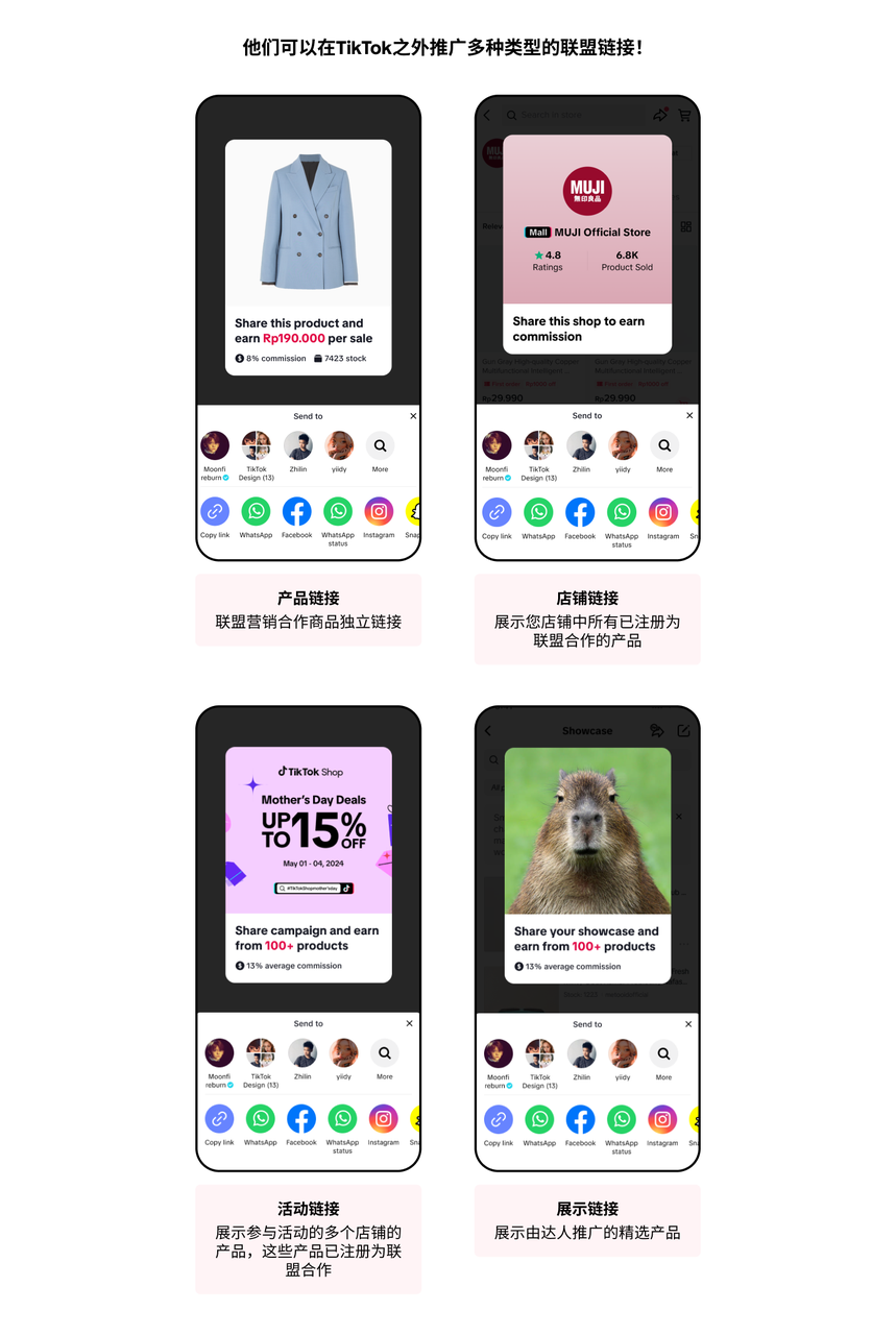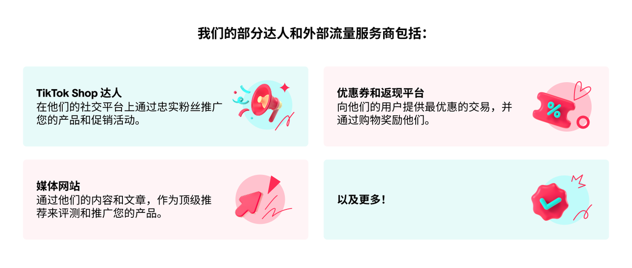 外部流量计划是 TikTok Shop 的一个联盟计划,允许达人和外部流量服务商使用联盟链接推广您的产品。他们可以在社交媒体、网站、应用程序等平台上分享这些链接,帮助您在 TikTok 之外接触到新客户,并推动额外的曝光,提升销售额。我们的部分达人和外部流量服务商包括: