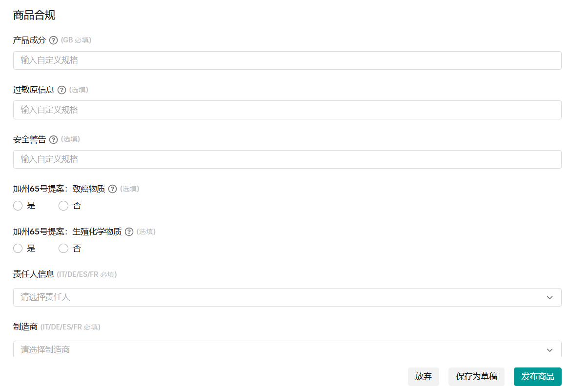 卖家必须根据当地法律提供所需的合规信息。所有信息和文件都应以市场的官方语言提交,以免产品上市被拒: