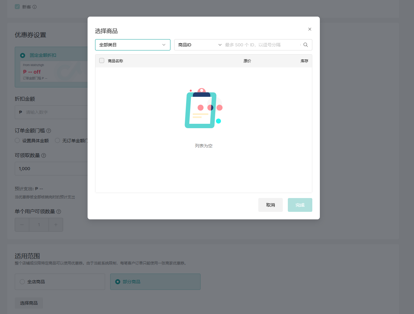 点击“部分商品”可以选择商品。在此页面上,可以通过商品类目、商品名称和商品ID进行筛选。