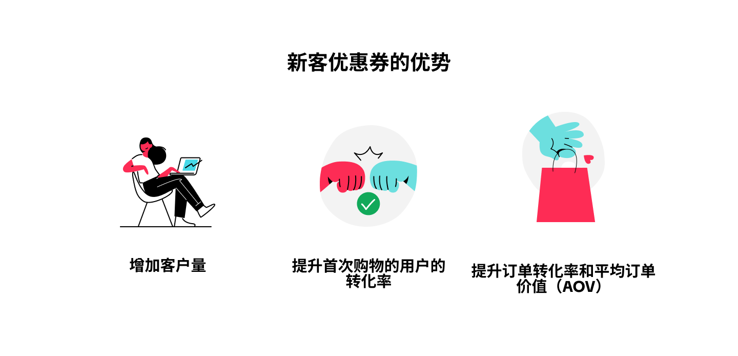为新客优惠券设置较低的最低消费门槛(或无门槛)可以提高首单转化率,扩大买家基数。