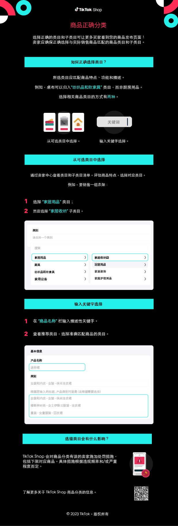 TikTok Shop致力于为所有用户打造方便快捷的购物体验。选择正确的商品类目能够让更多用户发现商品。因此,卖家必须确保为所售商品选择正确的商品类目。