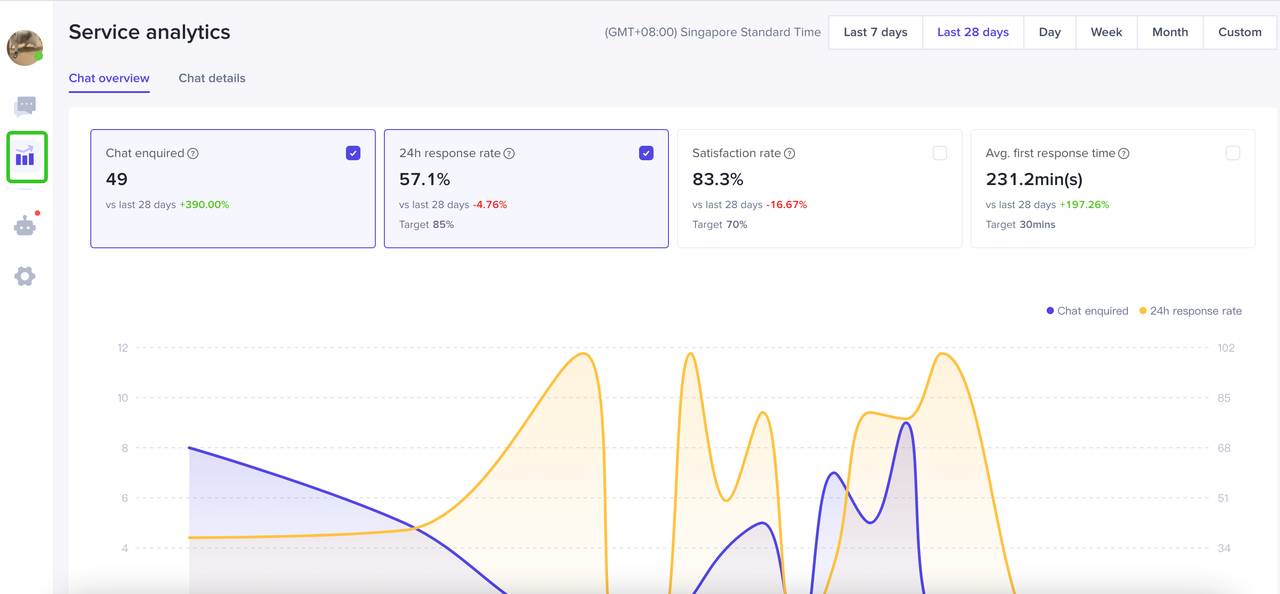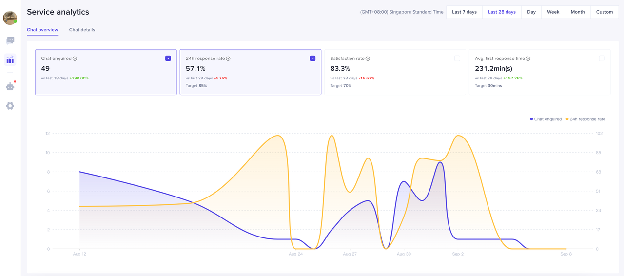 展示店铺在选择的时间范围内的顾客咨询数、24小时响应率、满意度、平均首次响应时长等。