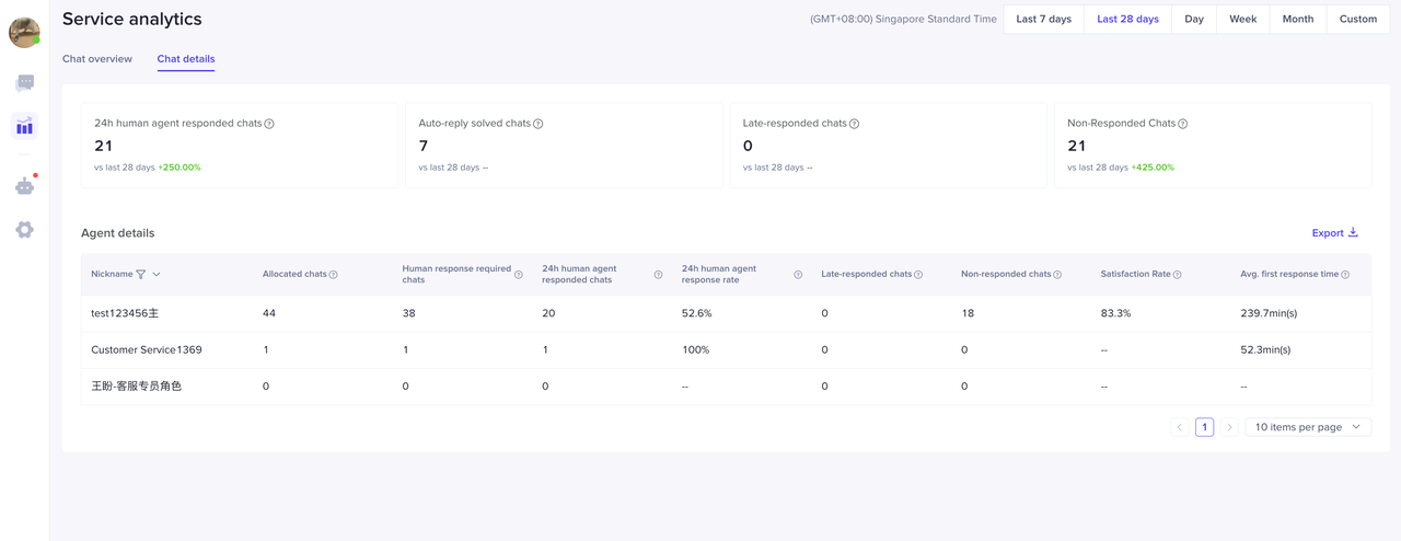 可查看每个客服人员在选择的时间范围内的被分配会话数、24小时人工响应会话数、超时响应会话数、未响应会话数、满意度、平均首次响应时长等。