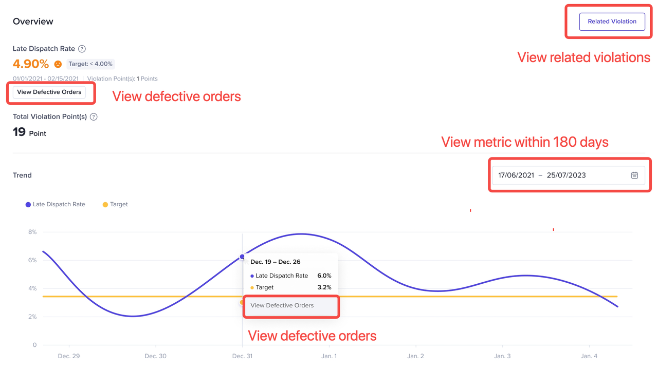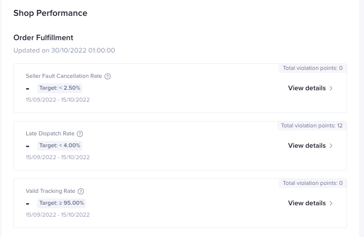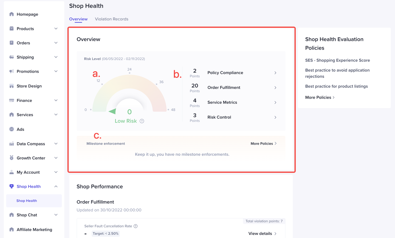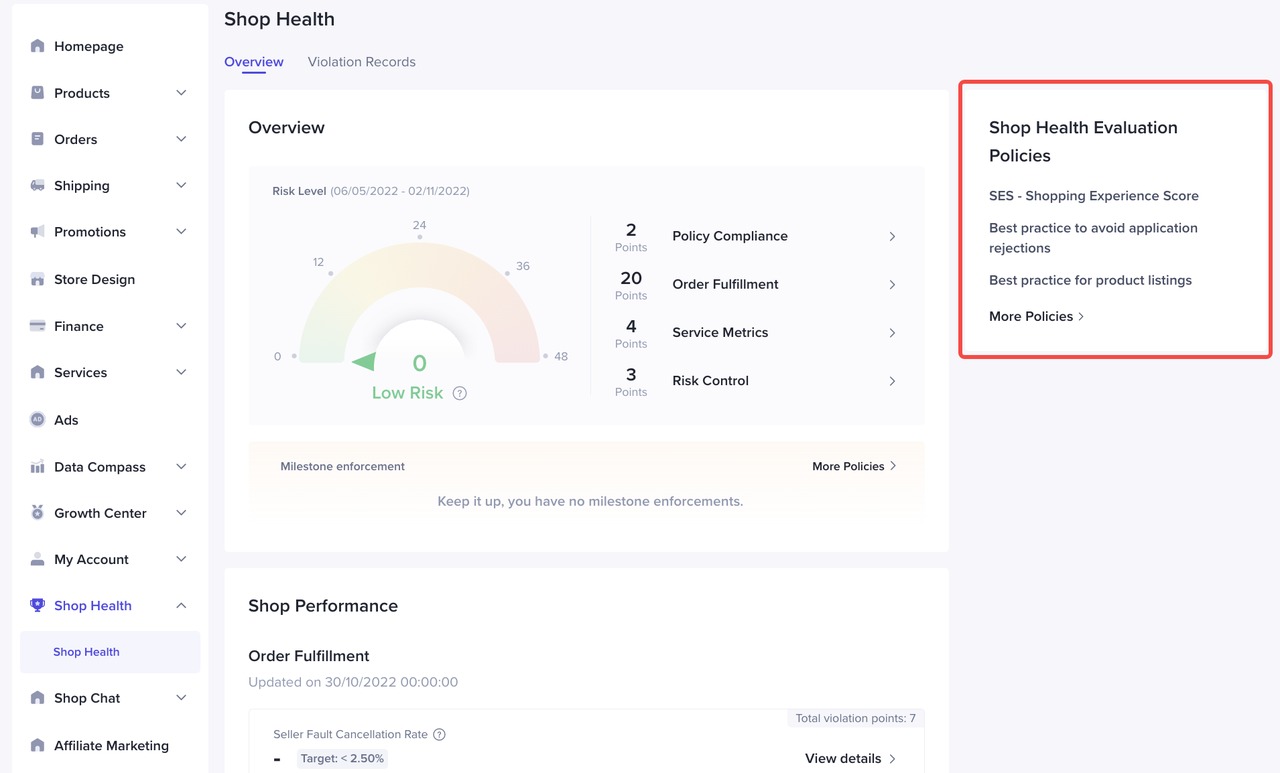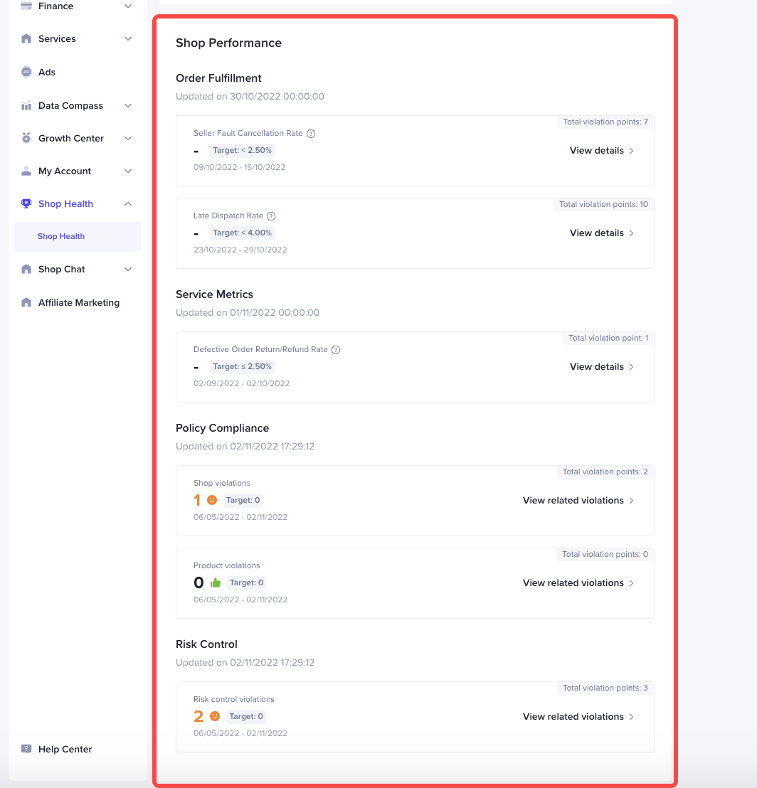 您可以看到店铺在订单履约,服务指标,合规底线以及风控欺诈的表现情况