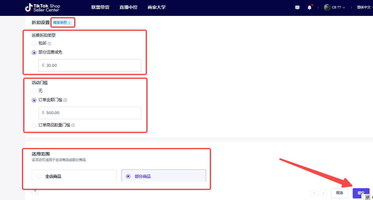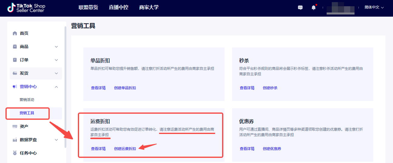 | 入口 | 营销中心-运费折扣 https://seller.tiktokglobalshop.com/promotion/free-shipping 注意:运费活动所产生的费用由商家自主承担 | ![]() ![]() |
