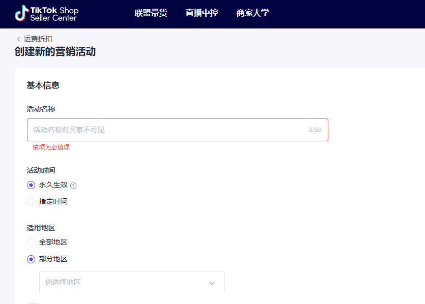 | 创建活动 | 进入“创建新的营销活动”,填写基础信息: – 填写“活动名称” – 选择“活动时间” – 选择”适用地区“:可以设置指定部分地区包邮 – 选择”运费折扣类型“:卖家可以选择承担买家的全部运费或者固定金额运费 – 选择”活动门槛“:卖家可以选择为运费折扣活动设置门槛,例如满足一定订单金额或一个订单中购买多件商品才可以享受运费折扣 – 适用于全部/部分商品 | ![]() ![]() ![]() ![]() |