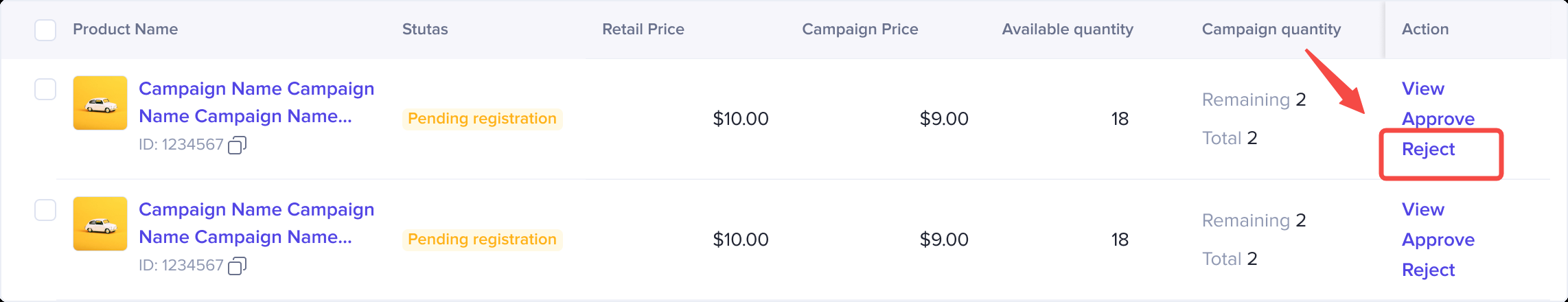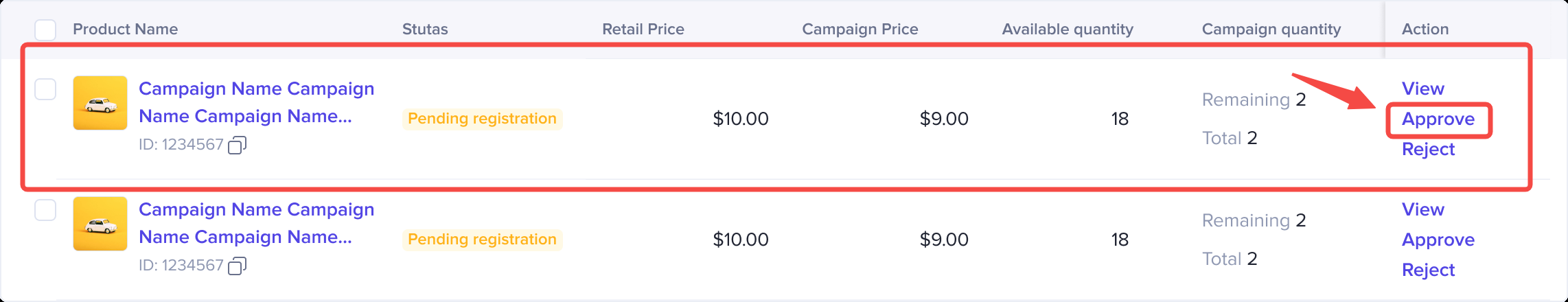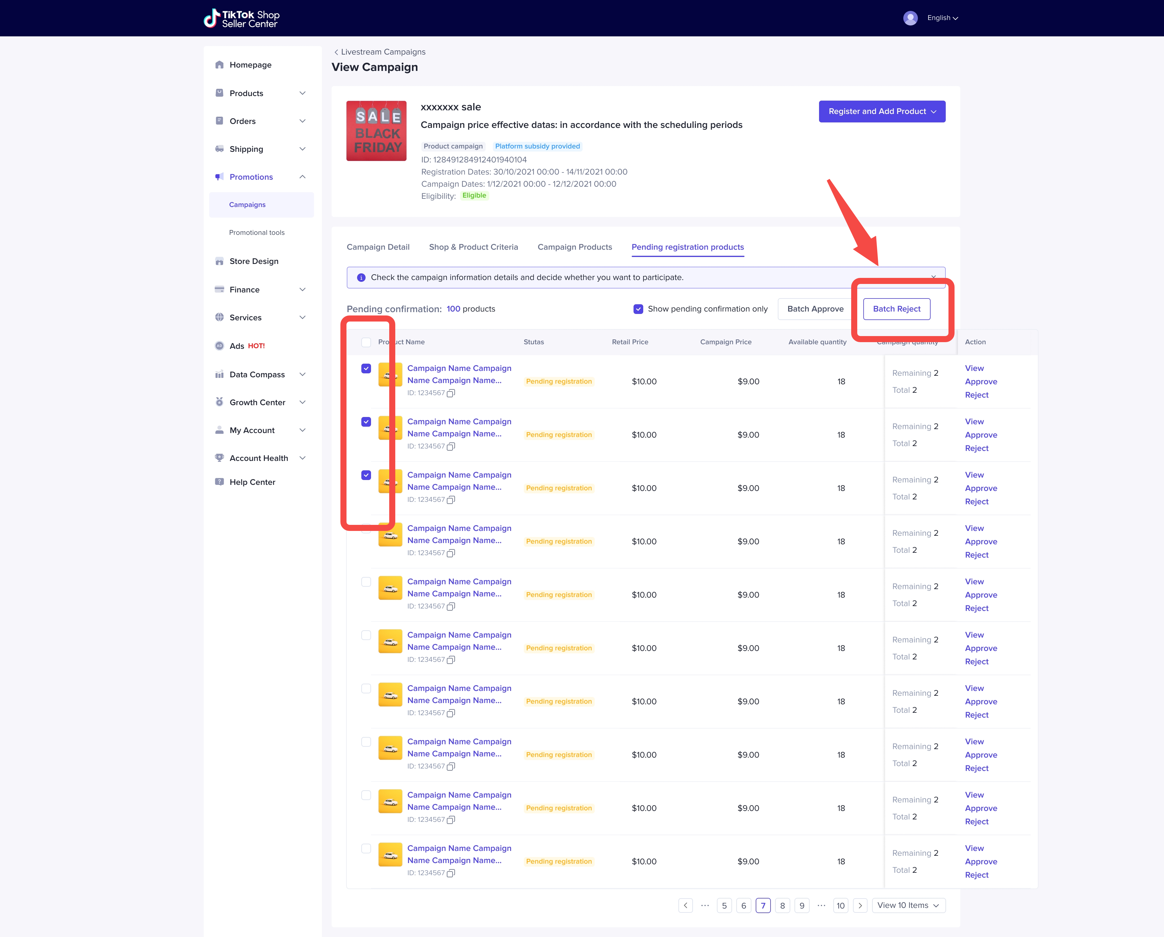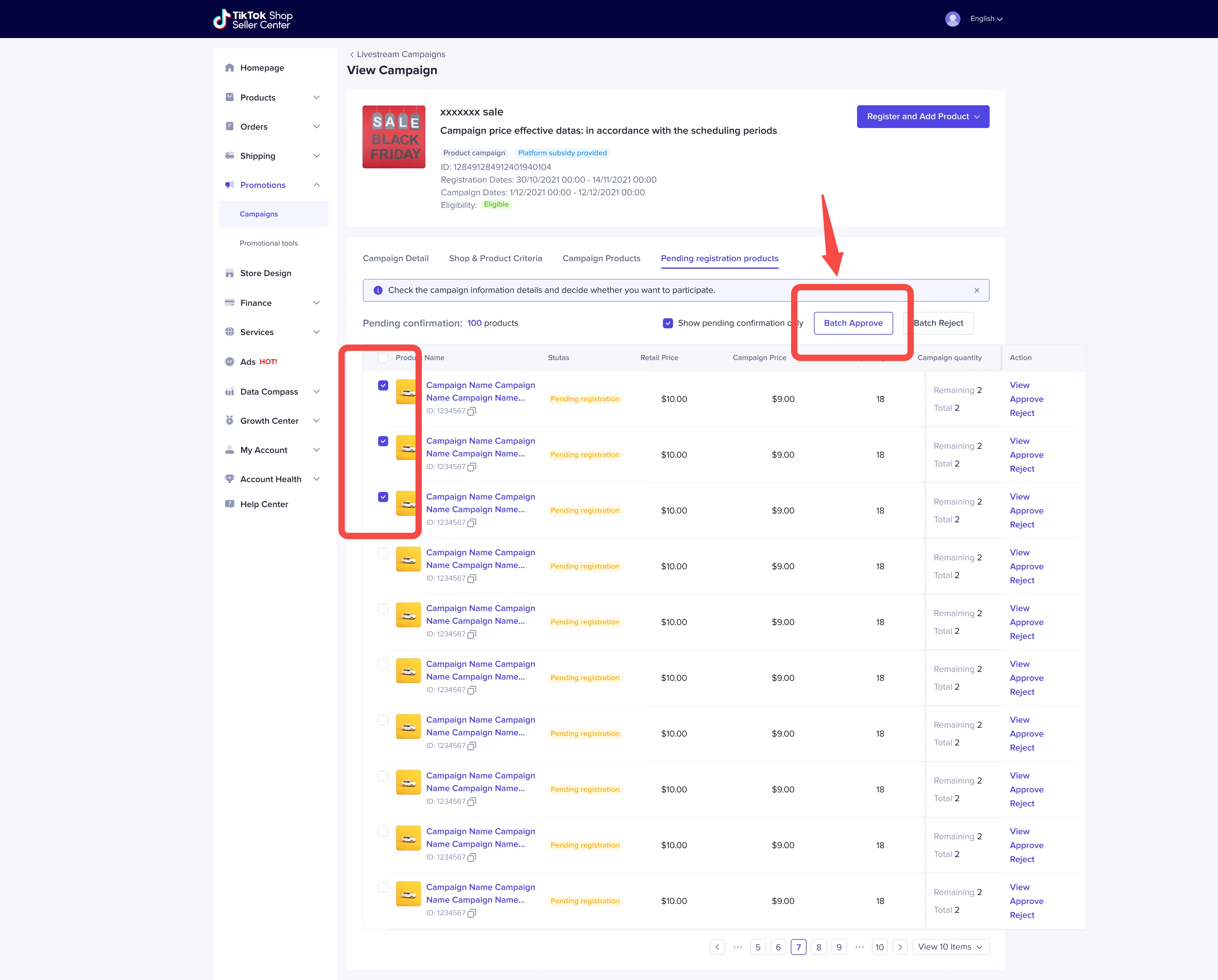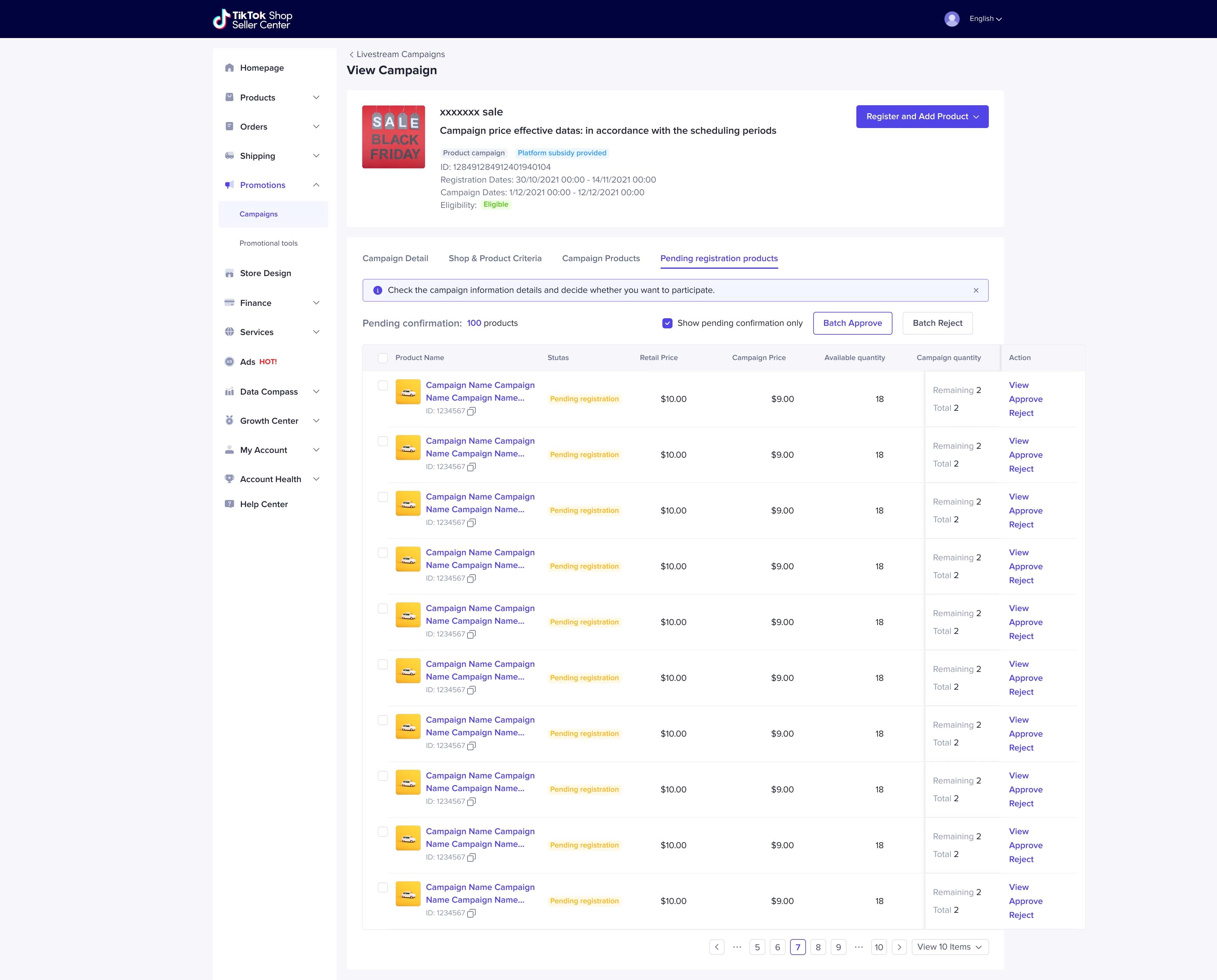 一旦商家同意代替报商品,则这些商品的状态会从【Pending Registration】变成【Under Review】并进入campaign product等待检验。且会在平台检验通过后,在活动生效时,锁定活动价格和活动库存。