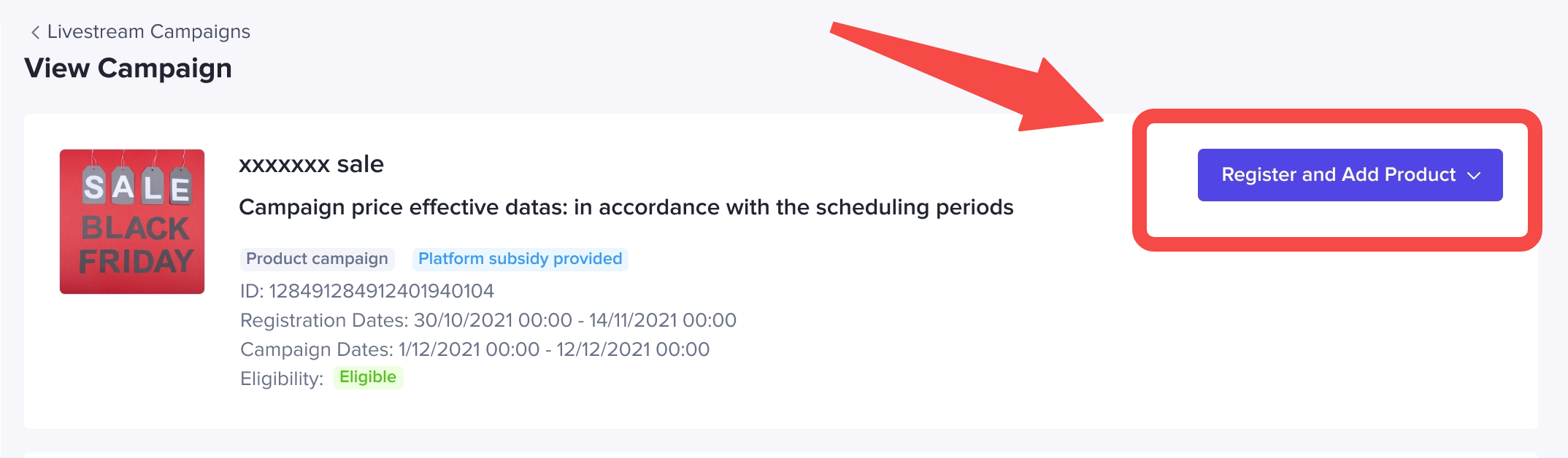 商家通过查询商家后台-Promotion-Campaign 模块。在recommendation-Pending registration products tab中展示目前在活动生效期,且被平台运营提报参加的商品活动。