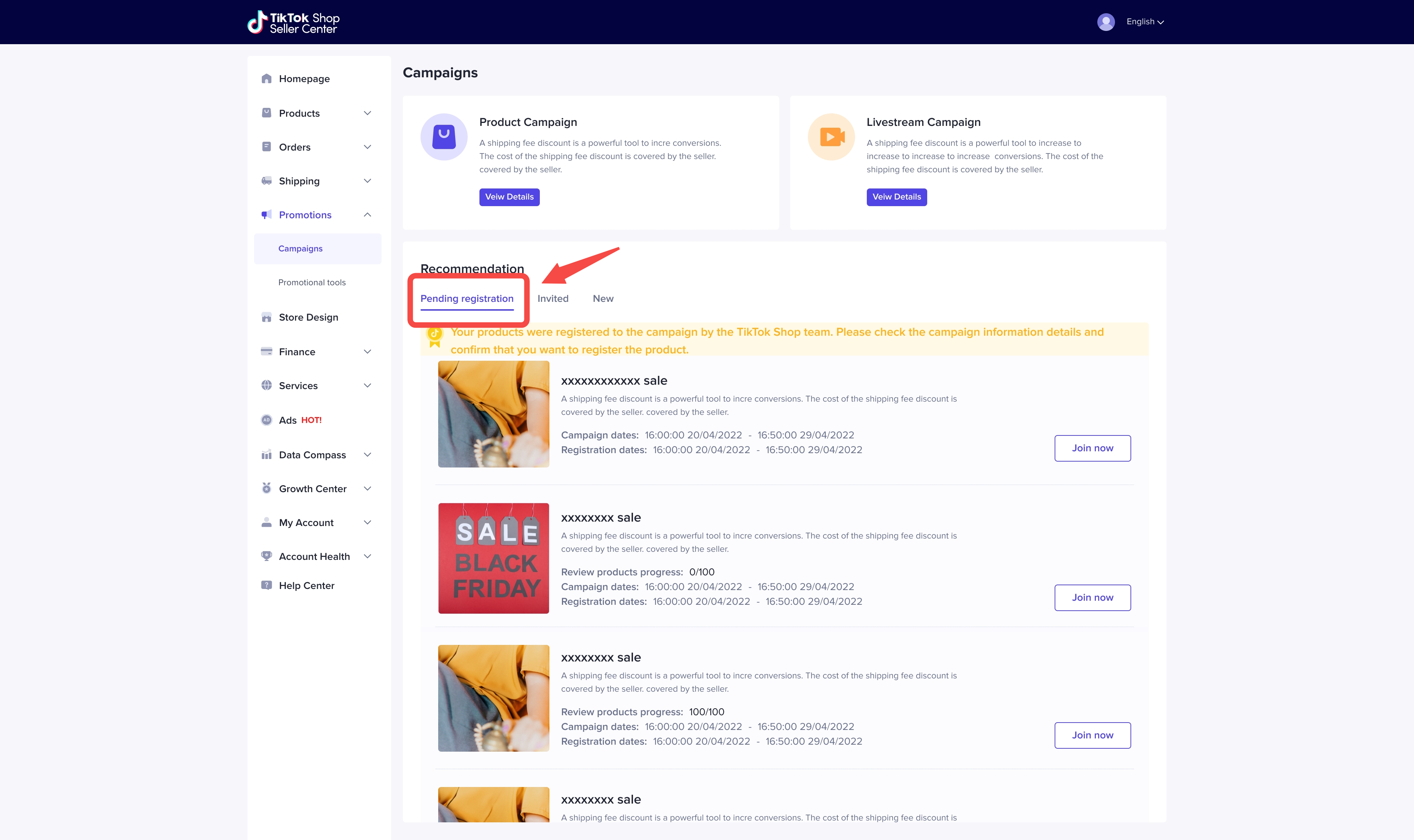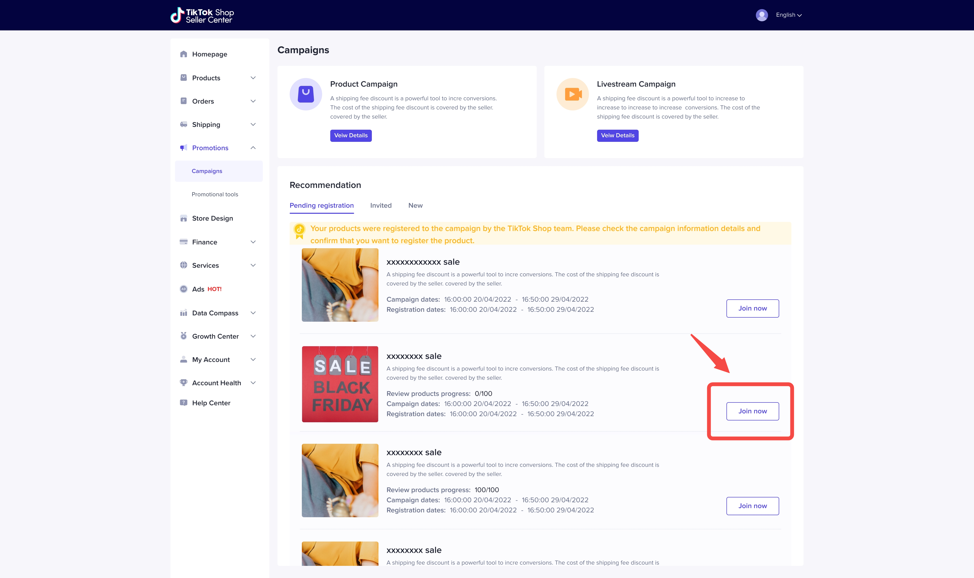 TikTok商店卖家中心>主页>宣传活动