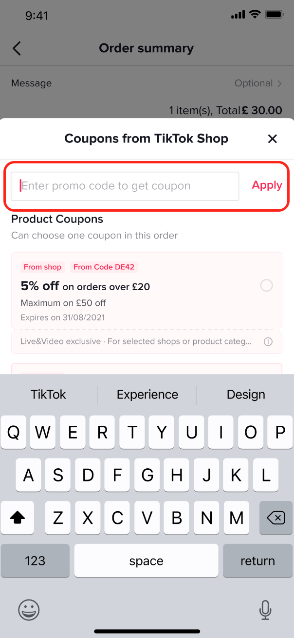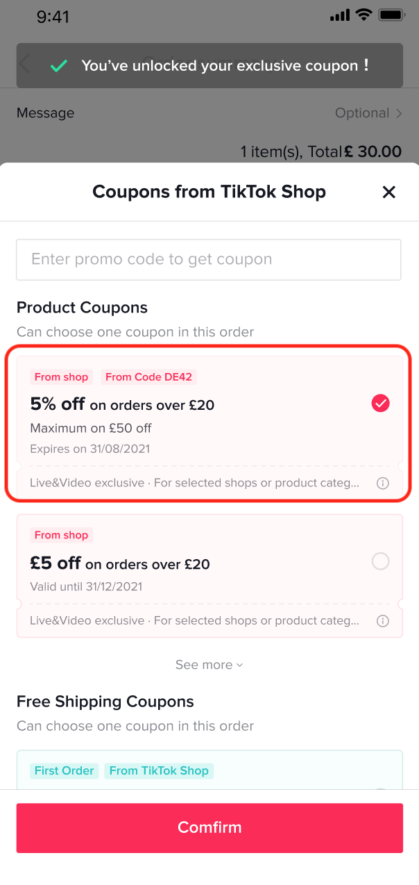 优惠码是TikTok Shop新增的促销活动,您可以在预热短视频中分享您的Code并向观众介绍如何将优惠码兑换成优惠券