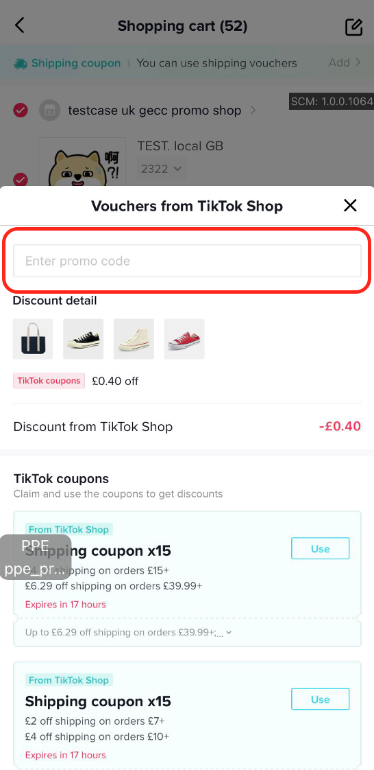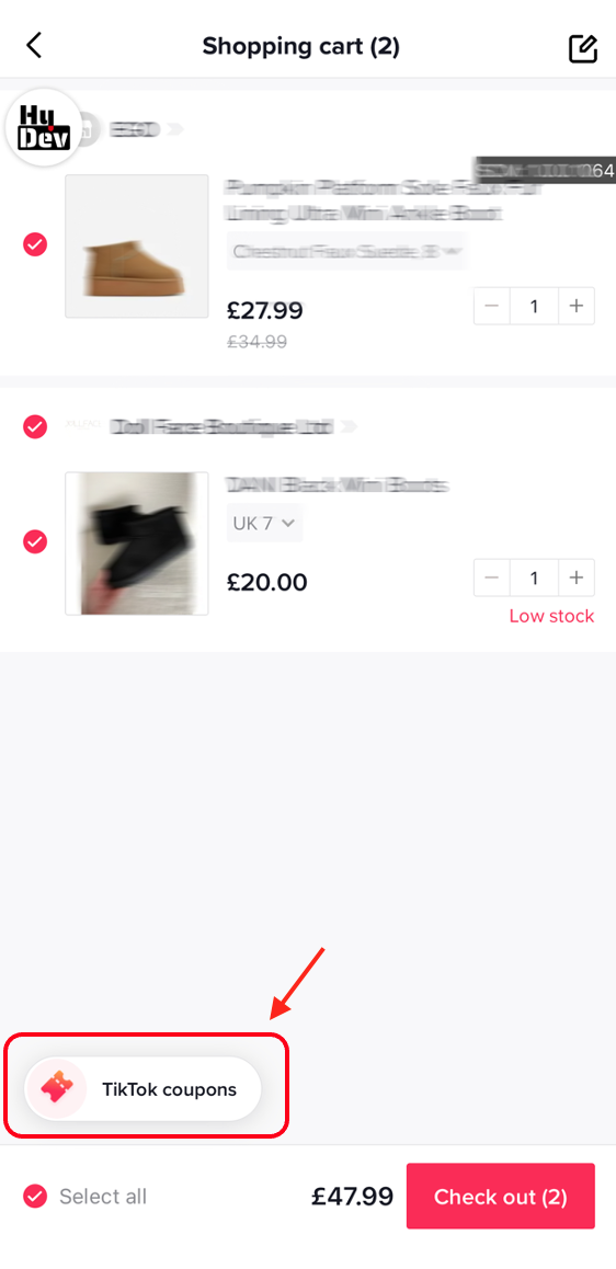 点击购物车左下角的 ‘TikTok coupons’ 小挂件
