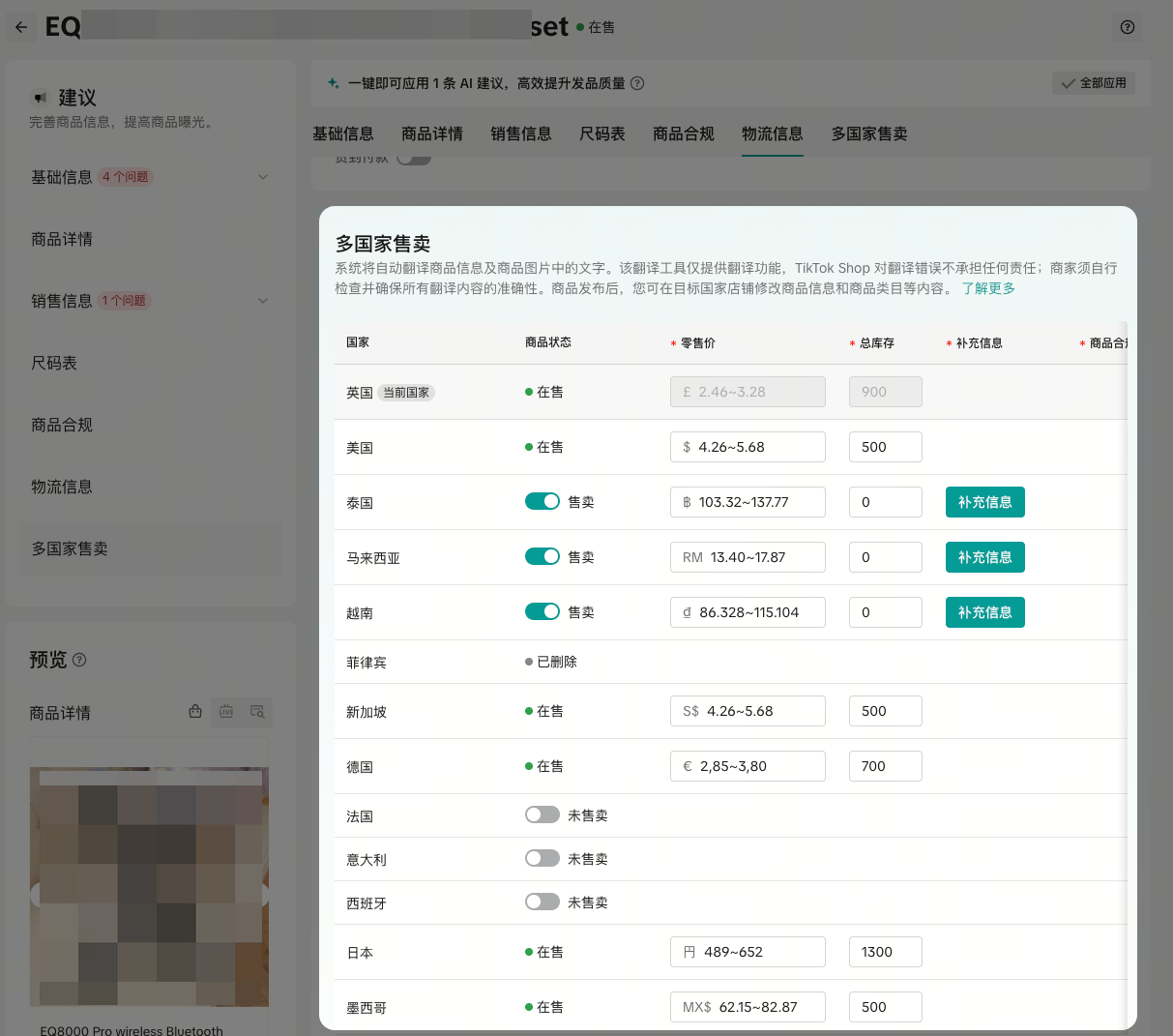 需要在「商品管理」页面,采用「多市场铺品」路径进行发品(创建商品→填写信息→设置多市场库存&售价→补充新市场合规信息→提交多市场审核→审核通过→展示售卖),如果您未使用上述「多市场铺品」路径,而是在多个市场分别发布了同一商品,该商品的销量评价将无法聚合展示。