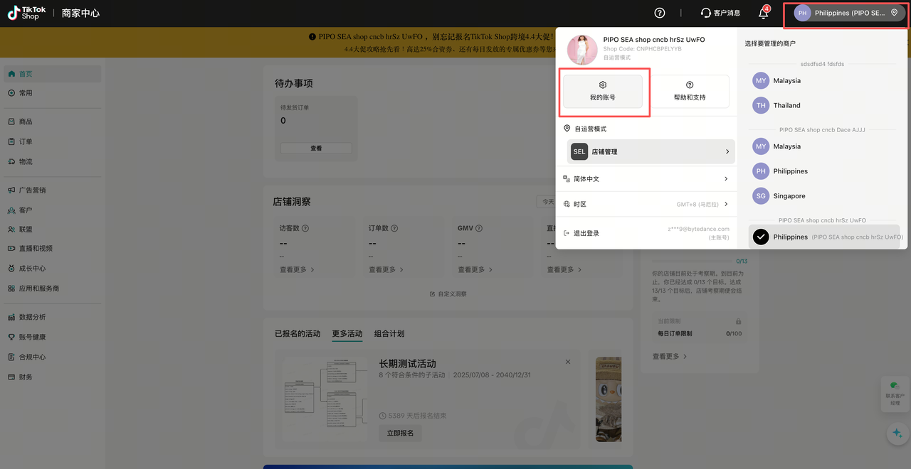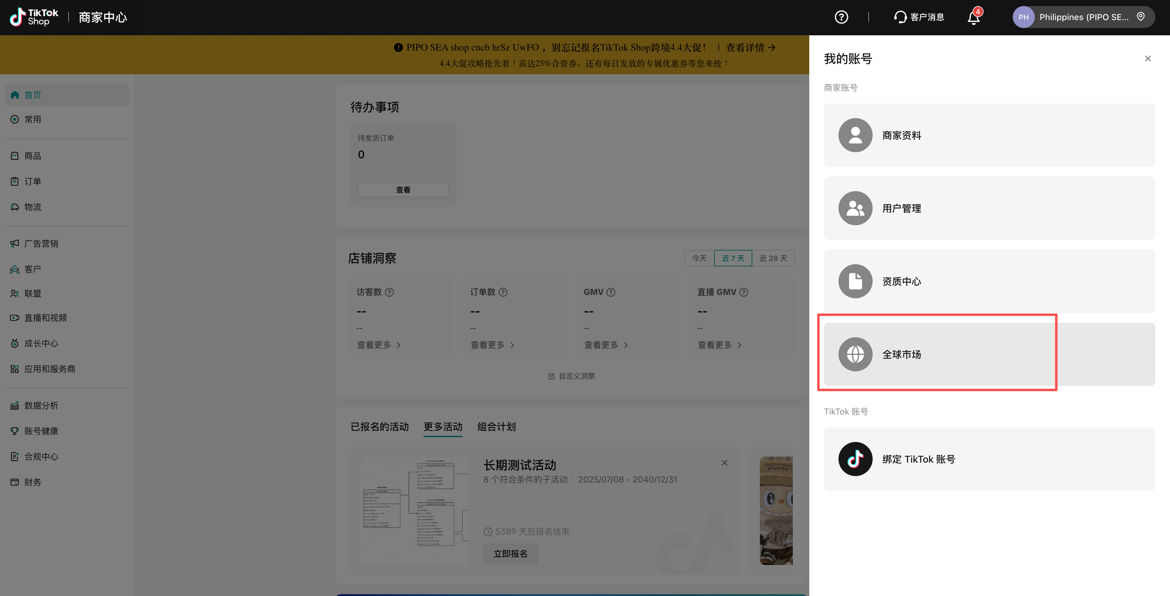 登录商家中心,点击店铺头像 → 我的账号 → 全球市场 → 进入店铺图谱页