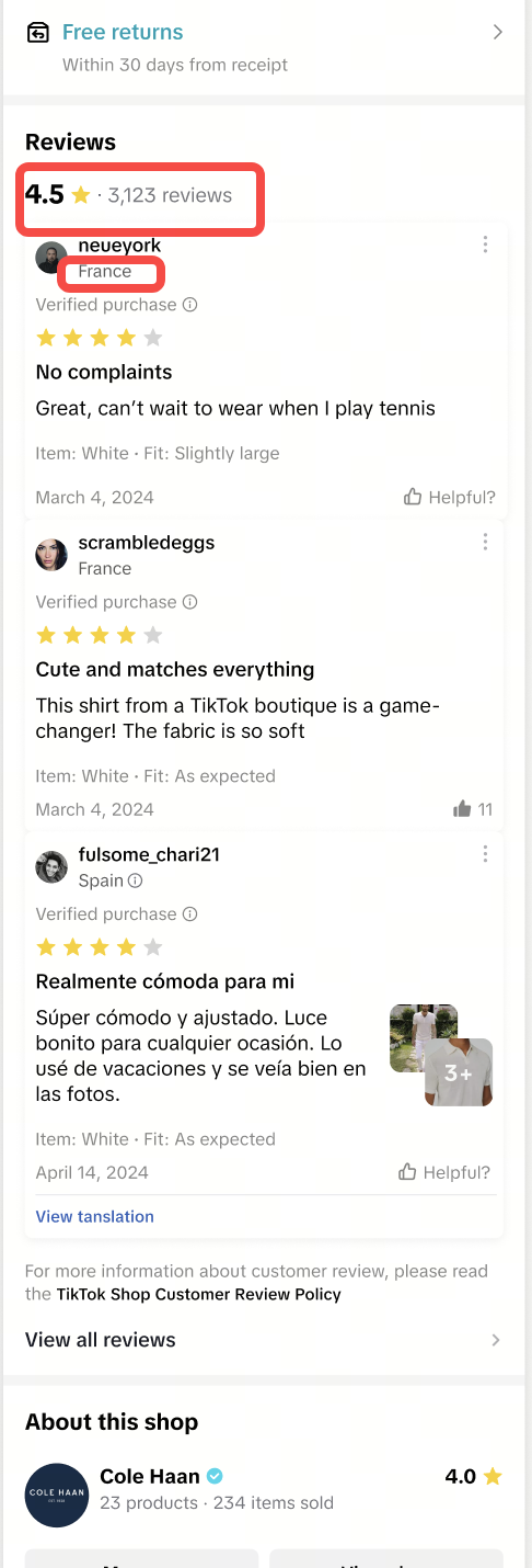 ![]() ![]() | – 消费者可以看到商品的全球评论以及全球评分 – 支持评价的本地过滤能力,用户点击“local review”时,可基于用户地理位置,仅展示本地评价。 ![]() ![]() |