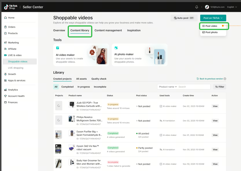 内容资产:内容与素材可一键发布至经营组下全球店铺的TikTok账号