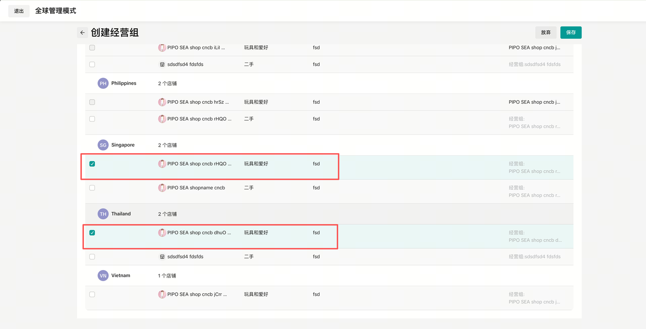 点击创建经营组后,将展示当前账号下所有可选店铺列表
