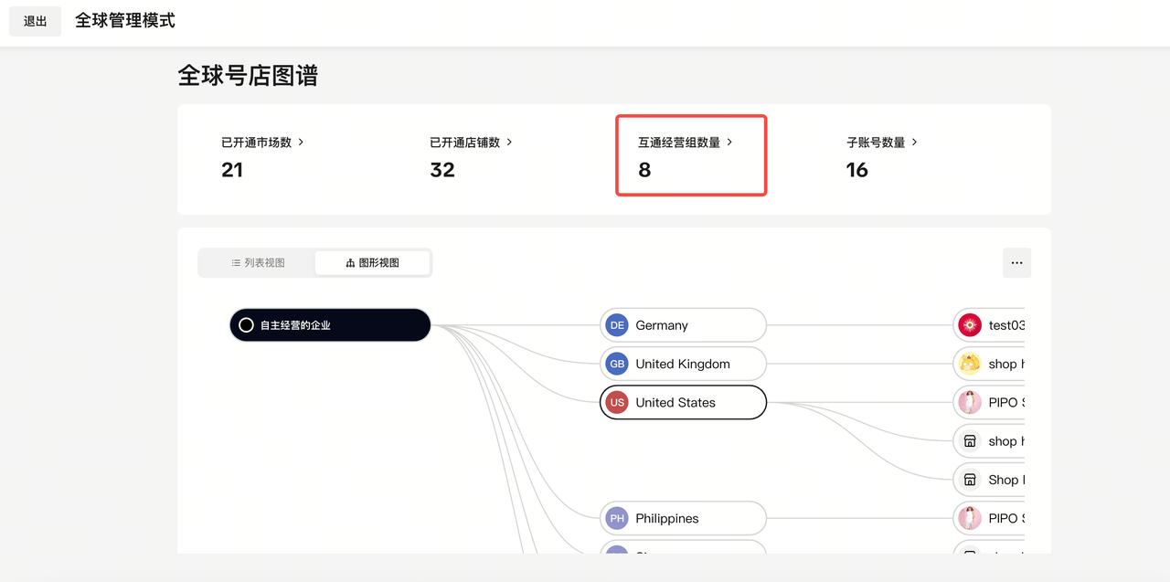 在店铺图谱页,您可在上方查看【已开通市场数】、【已开通店铺数】、【互通经营组数】、【子账号数】,并可自由切换列表视图或图形视图,一站式查看集团下各市场的所有店铺