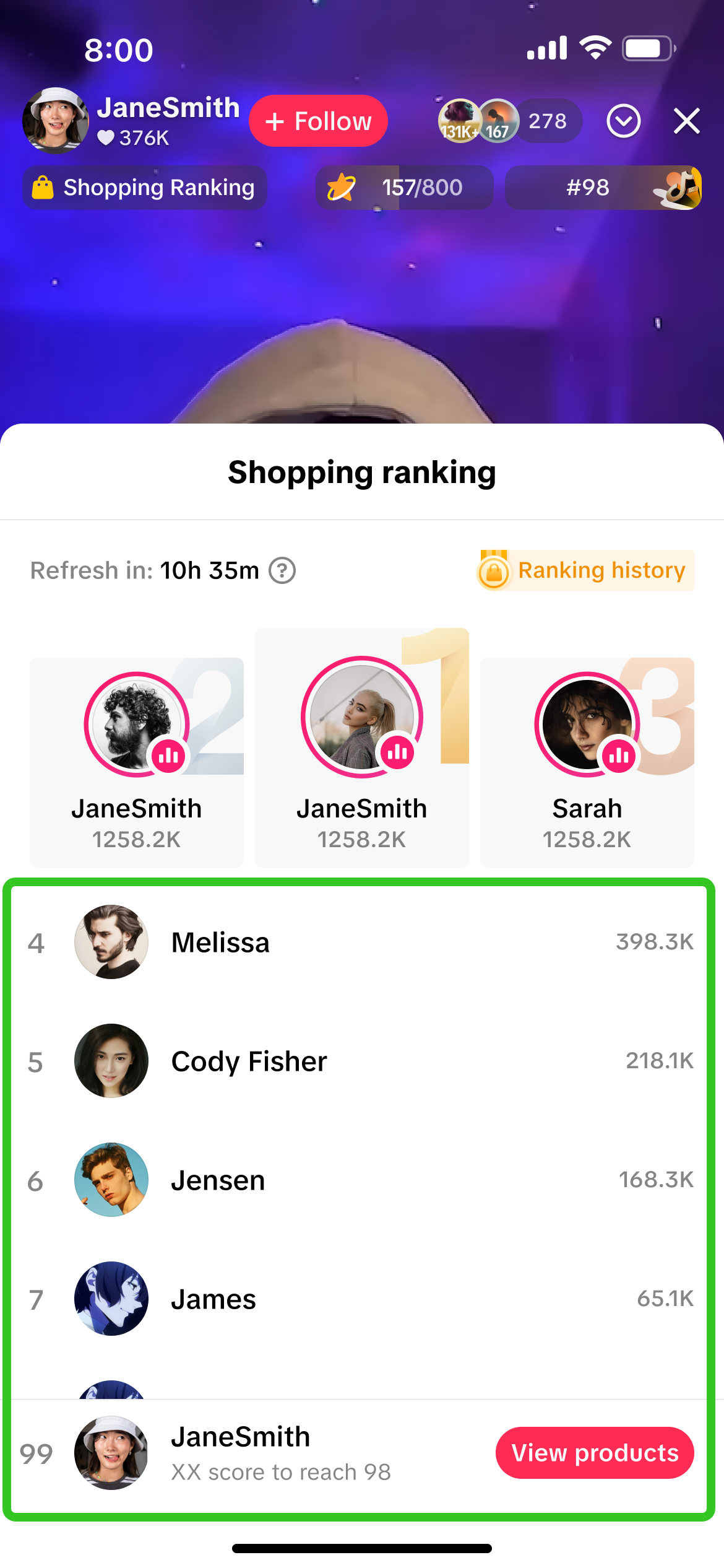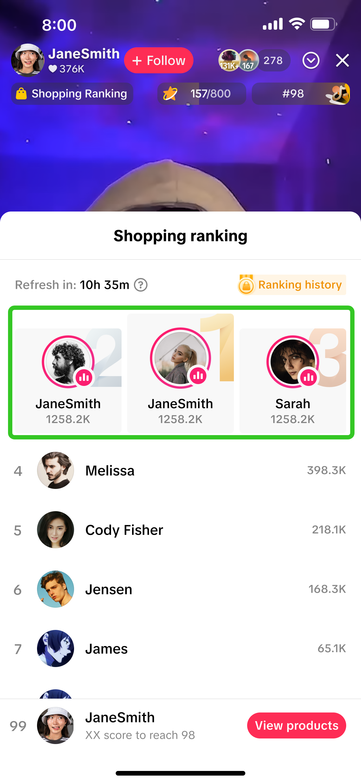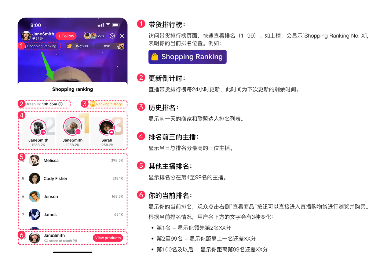为提升主播及其直播间在潜在观众中的曝光度,所有直播商家和联盟达人均默认自动开启直播带货排行榜功能。上榜时,仅会显示主播的用户名、头像和排名积分。