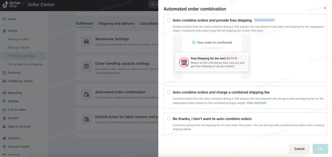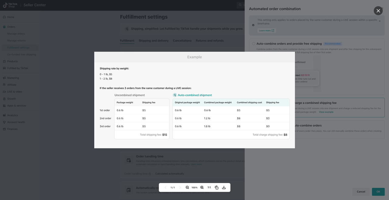 TikTok Shop会自动合并在直播间下的所有订单并根据合并订单计算运费。为优化效率,降低成本,建议商家在每日下播后再开始履约订单。
