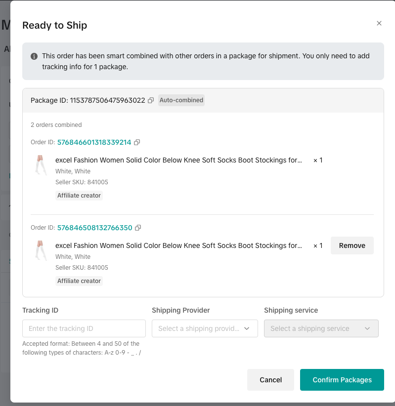 第三方物流商家可以启用此功能,查看“管理订单”中的自动合并订单,查看已合并包裹详情,取消合并或重新合并包裹,以及确认发货。