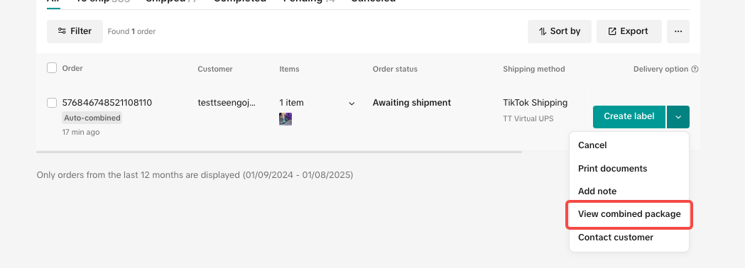 跨境商家可以启用此功能,查看“管理订单”中的自动合并订单,查看已合并包裹详情,取消合并或重新合并包裹,以及确认发货。