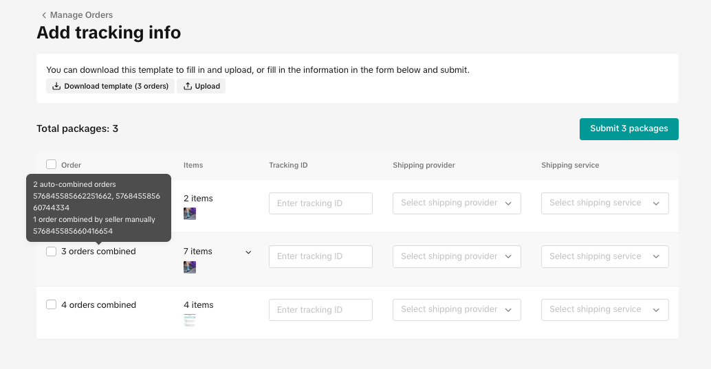自动合并订单可与常规订单进行合并,然后商家可以编辑追踪号。