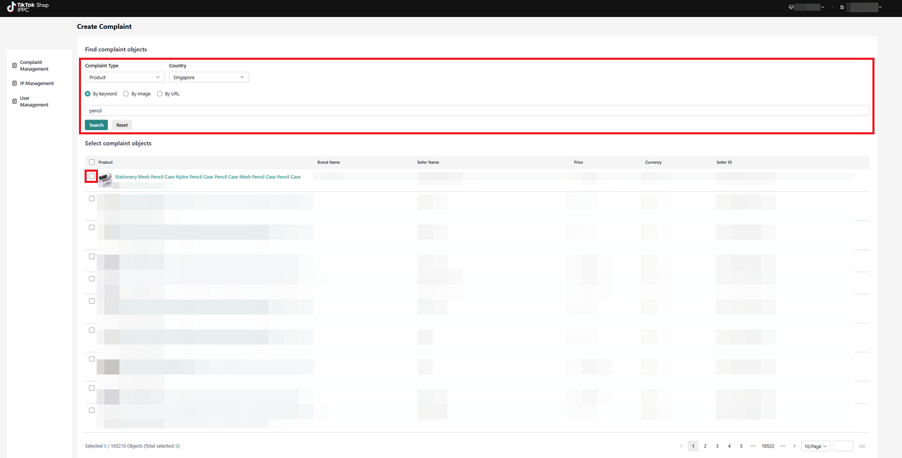 选择投诉类型和国家,然后搜索需要举报的商品、视频或直播。