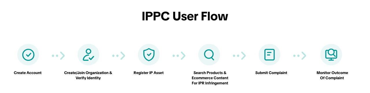 创建账号->注册IP资产->创建/加入组织并验证身份->搜索商品和电商内容以识别知识产权侵权行为->提交投诉->监控投诉结果