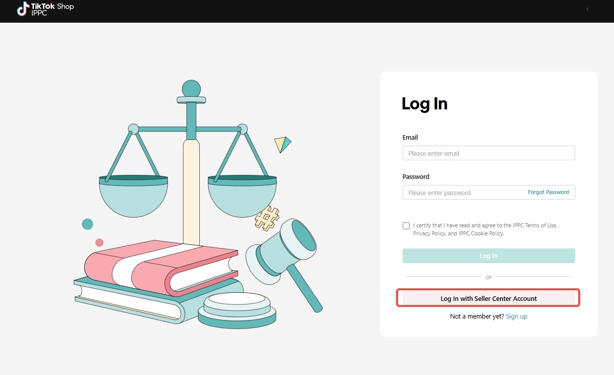 导航至IPPC登录页。如果您已经拥有TikTok Shop商家账号,也可通过联通使用商家账号凭证登录。