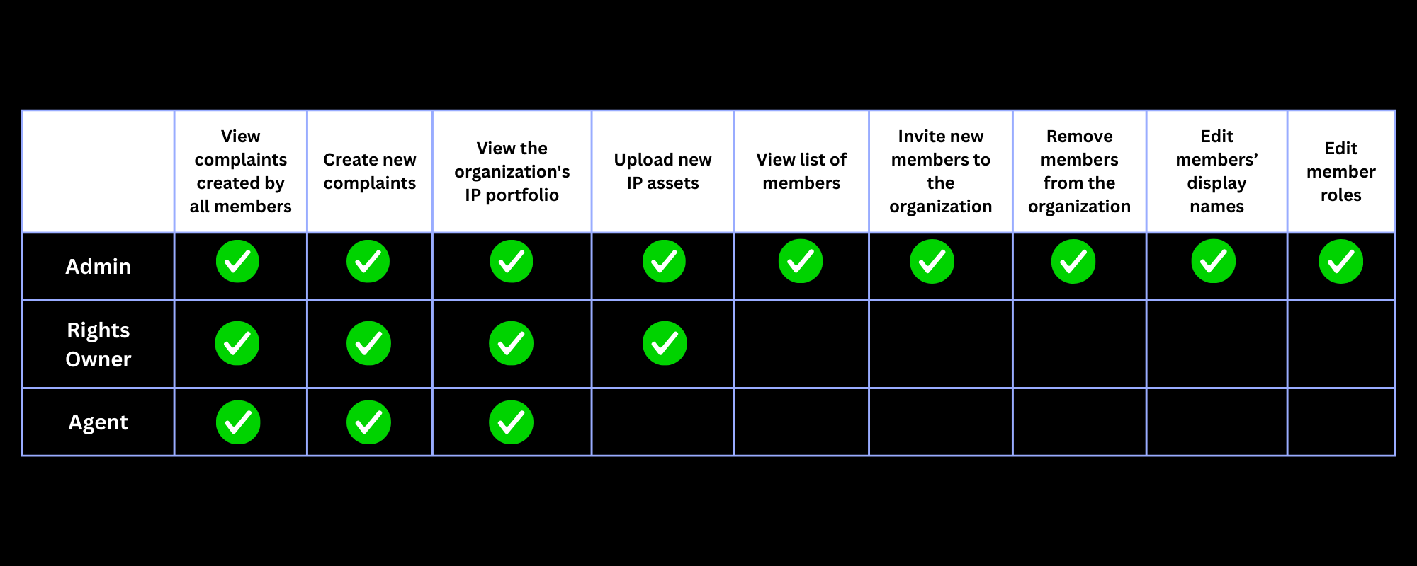 您在组织中可以拥有以下三种角色之一:管理员、权利人和代理人。您的权限取决于您拥有的角色。
