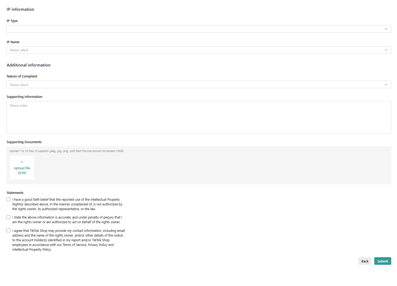 选定需举报的所有项目后,请按顺序从上至下完整填写表单各部分。每个选择都将影响后续选项内容。例如,如果跳过“投诉性质”部分,则无法选择IP资产。