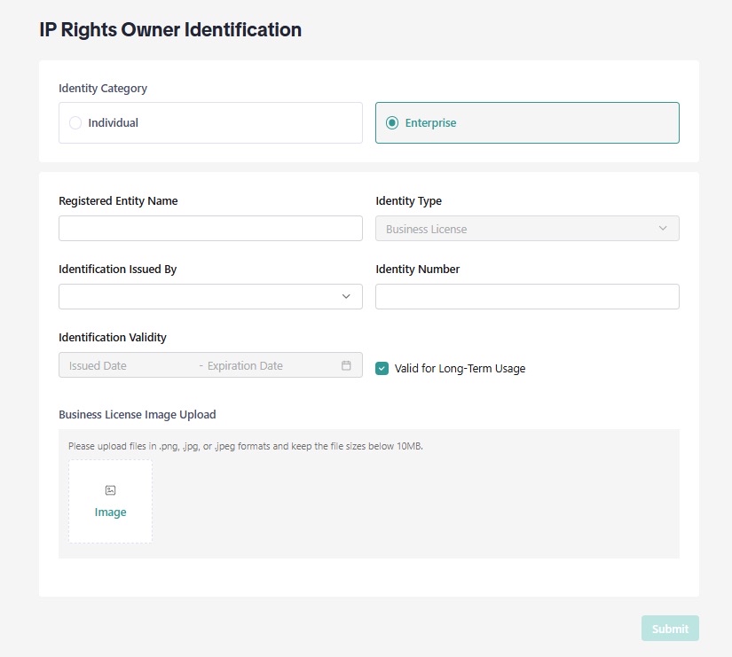 如需注册新的IP资产,请在“IP管理”页面点击“上传知识产权文件”。选择需保护的IP资产类型,并提交所需文件。