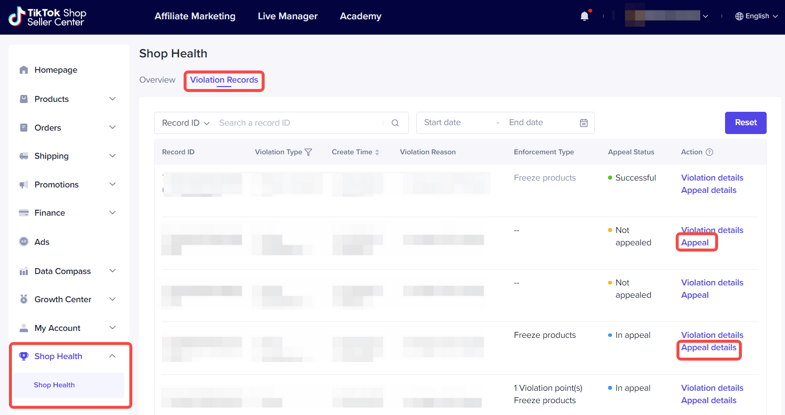 | 提交申诉并查看申诉状态 | 1. 请登录TikTok Shop卖家中心 2. 点击“店铺诊断”,选择“违规记录” (Violation Records) 选项 3. 点击“申诉”按钮进行申诉 4. 申诉完成后,您可点击“申诉详情”查看申诉状态 ![]() ![]() |