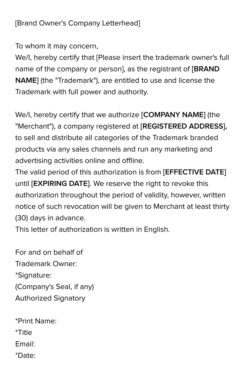 | | 过度使用 | 未经商标所有人授权,在商品发布图片中使用他人的商标,以显眼方式推广商品/服务。 | 商标所有人或一级分销商提供的授权书 – 卖家提交的授权书中必须包括以下信息: – 授权方的名称 – 被授权方的名称 – 授权权利(被投诉商品的商标使用权) – 授权国家/地区 – 授权期限 – 授权方盖章(如果知识产权所有者是法人实体) – 知识产权所有人的签名(如果知识产权所有人是法人实体,则由代表签名) |