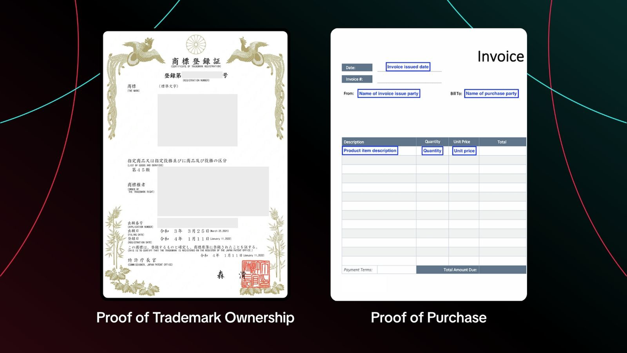 以下是一些证明文件示例。请注意,以下示例并非详尽无遗,文件可能因当地知识产权局、知识产权所有人、经销商和零售商的不同而有所差别。