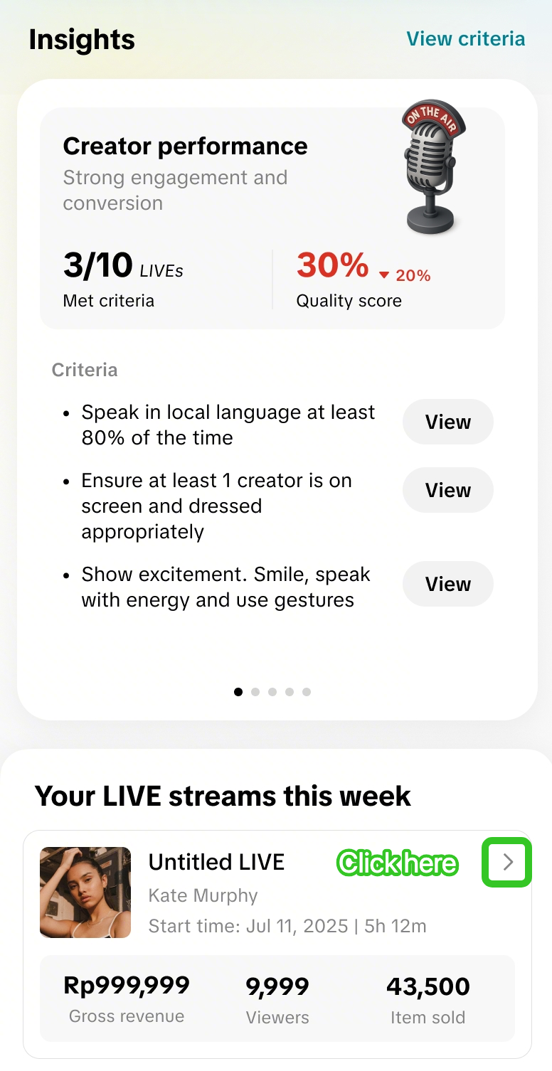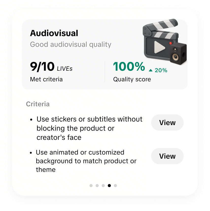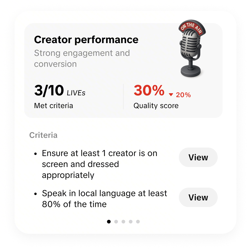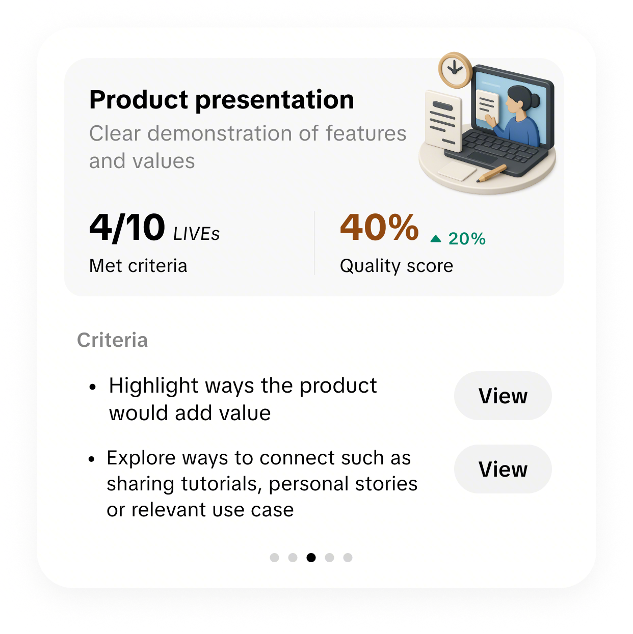 | | | 1. 基于直播质量标准分析直播表现 左右滑动页面,可查看直播评分情况,依据如下: – 达标场次:符合对应质量标准各项要求的直播总场次。 – 优质率:所选统计周内,满足“优秀”标准的直播数量占总直播场次的百分比。 获取多项直播技巧,提升后续直播表现。 |