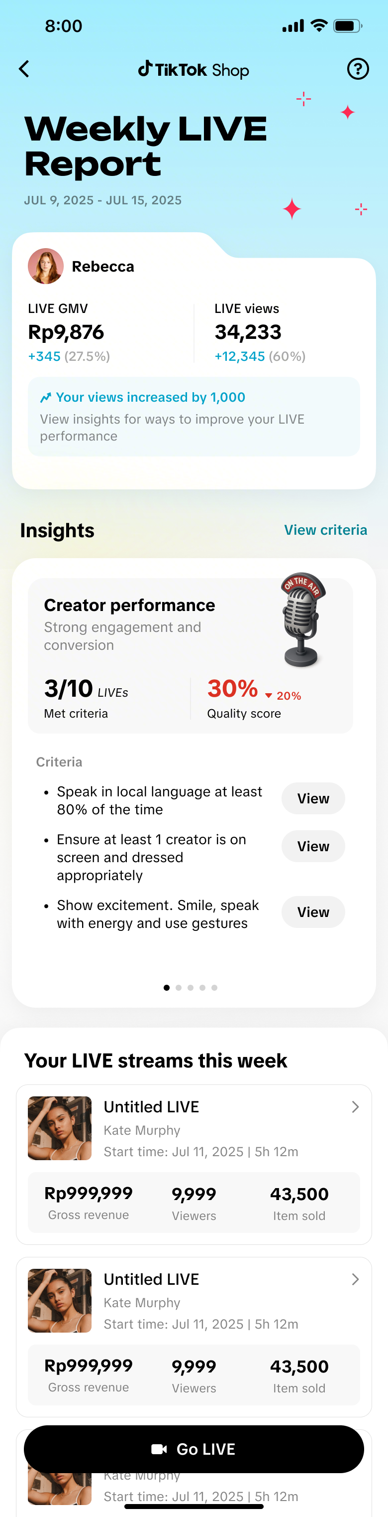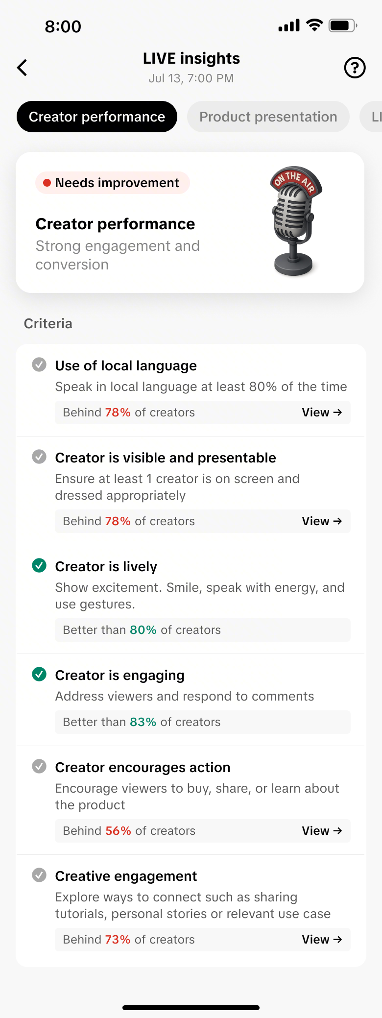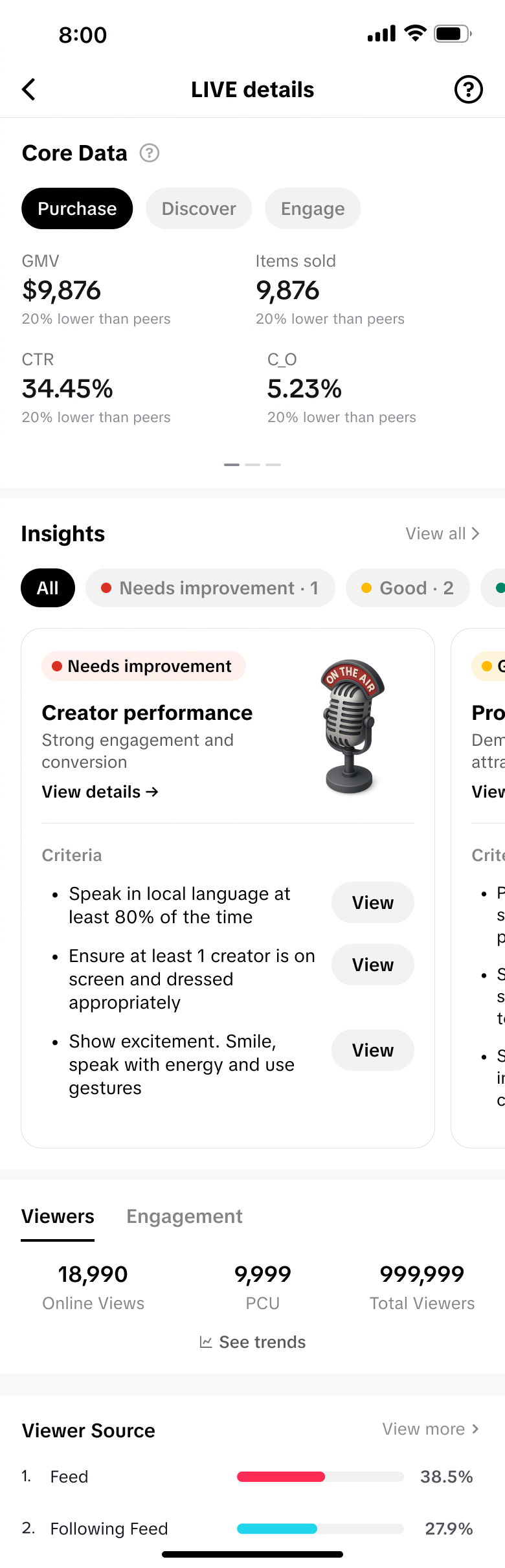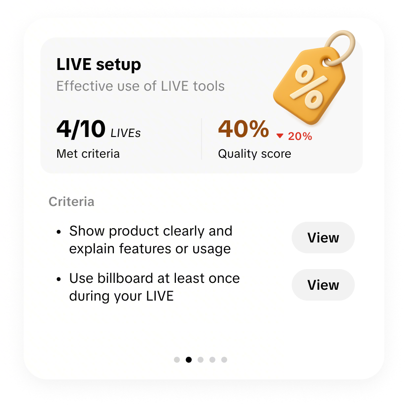 | | | 1. 基于直播质量标准分析直播表现 左右滑动页面,可查看直播评分情况,依据如下: – 达标场次:符合对应质量标准各项要求的直播总场次。 – 优质率:所选统计周内,满足“优秀”标准的直播数量占总直播场次的百分比。 获取多项直播技巧,提升后续直播表现。 |