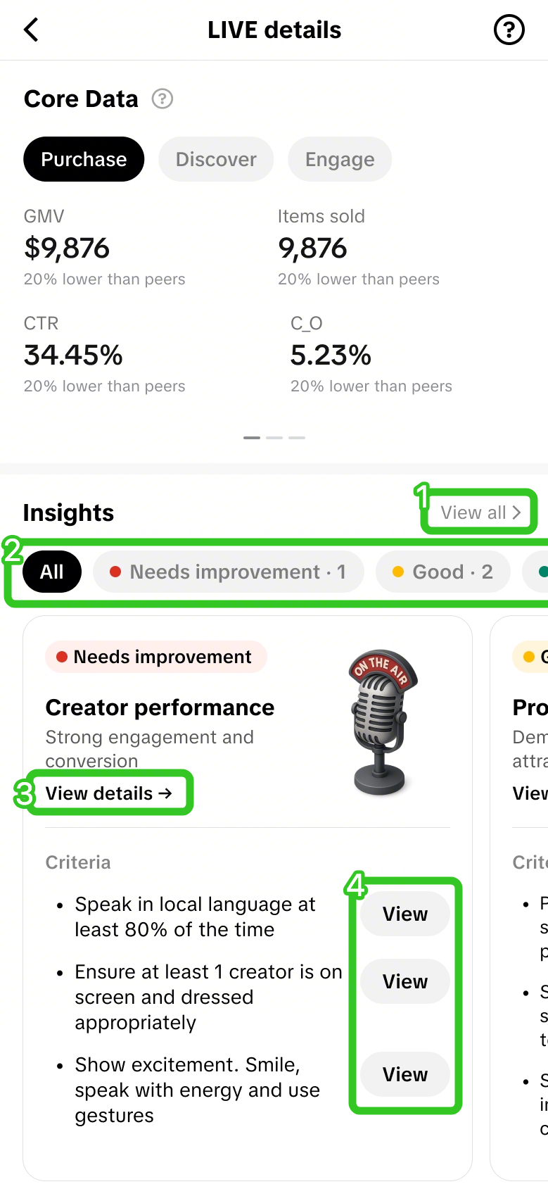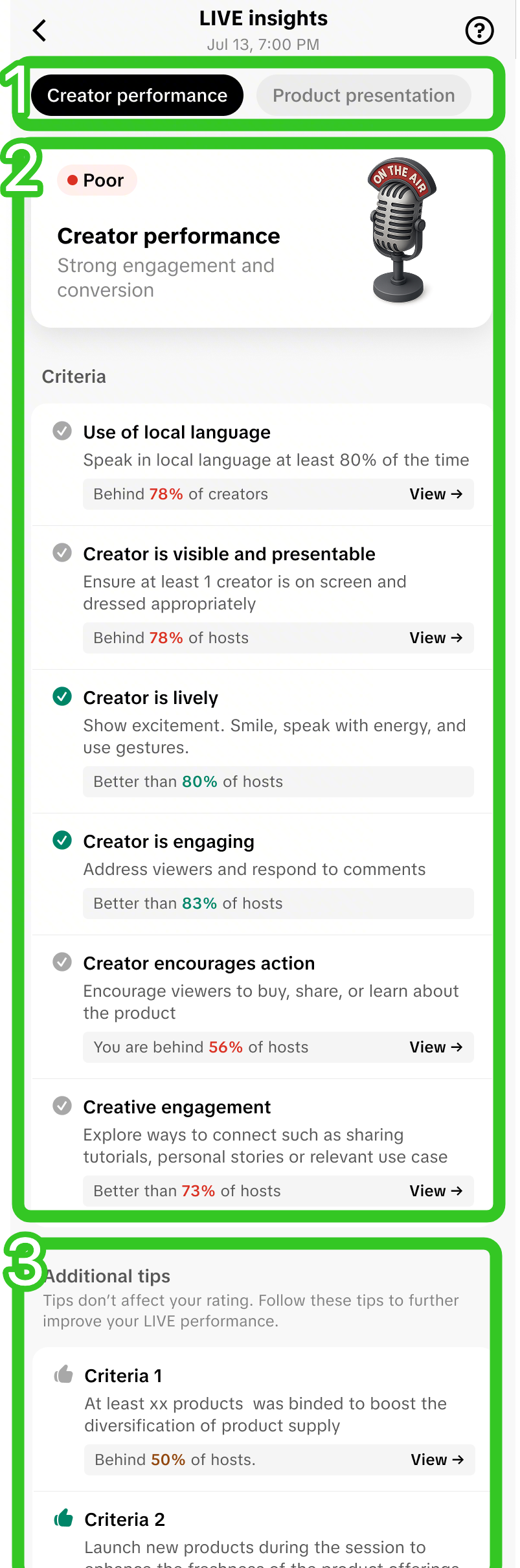 ![]() ![]() | 直播数据分析页面 1. 可切换四大质量标准维度,选择任意维度进行分析。 2. 查看在“待提升”“良好”“优秀” 评级体系下的各维度具体表现。 3. 页面展示的各项标准要求,是提升对应质量维度整体表现所必需的操作。达标项越多,获评“良好”或“优秀”的概率越高。 4. 获取更多提升后续直播表现的实操技巧 – 此类技巧为优化直播表现的推荐建议。 提示:在各质量标准维度下,找到标注有“落后于X%达人”的指标,这就是需要重点优化的方向! – 点击“查看”,可获取提升该指标的详细操作指南。 – 相应地,标注有“优于X%达人”的指标,是直播优势的体现,建议继续保持,拉开与其他达人的差距! |