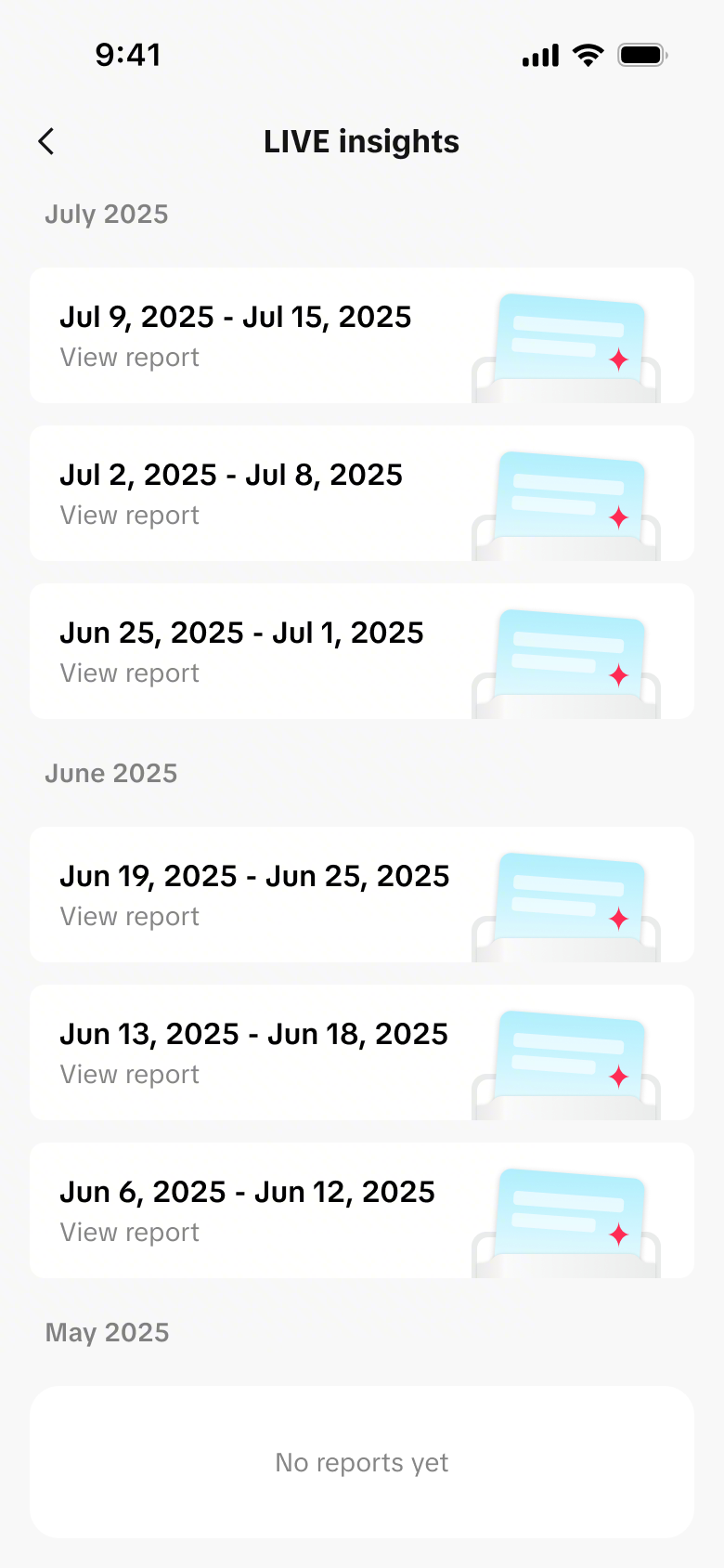通过周直播数据分析,可查看历史周报告库,对比各周直播表现!