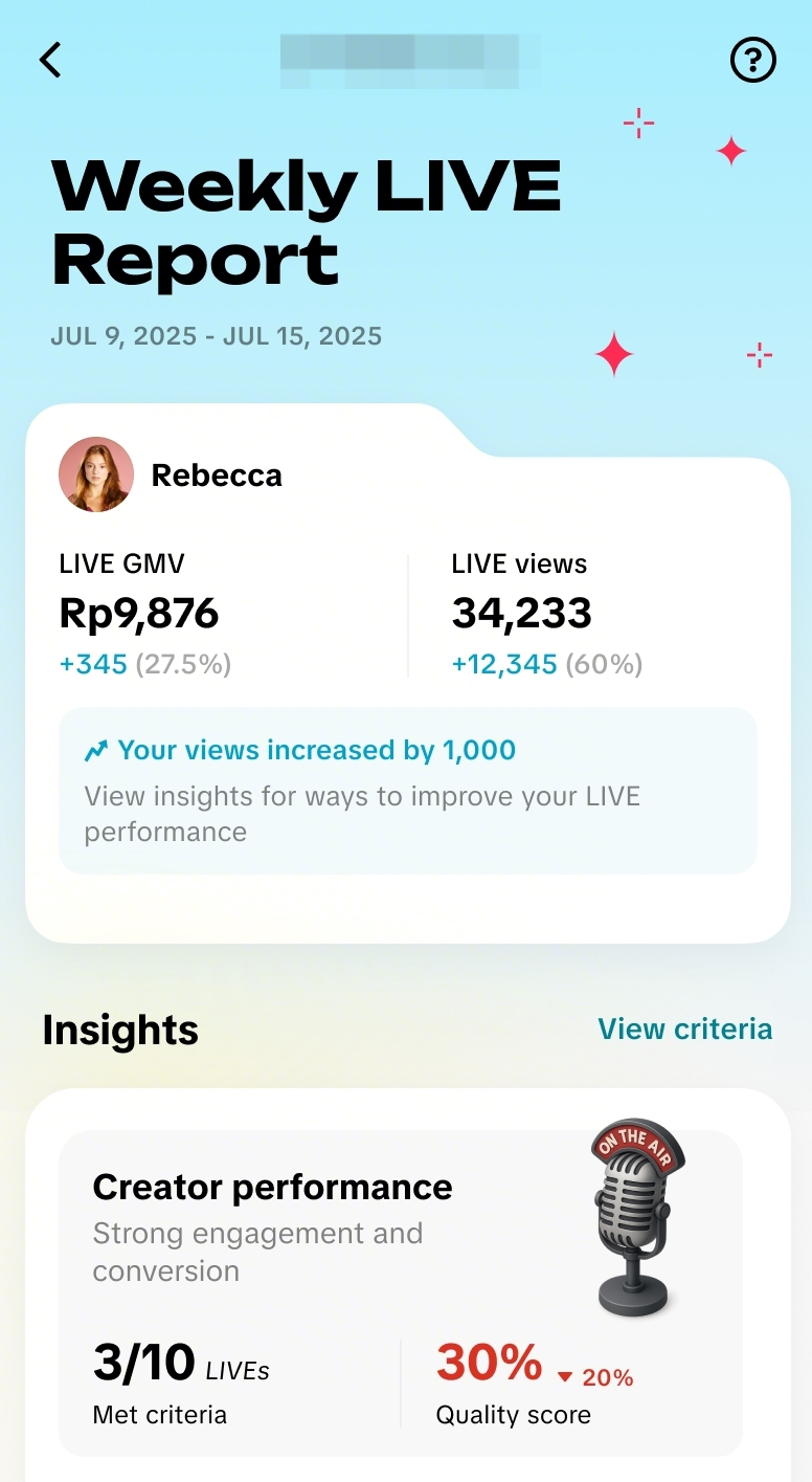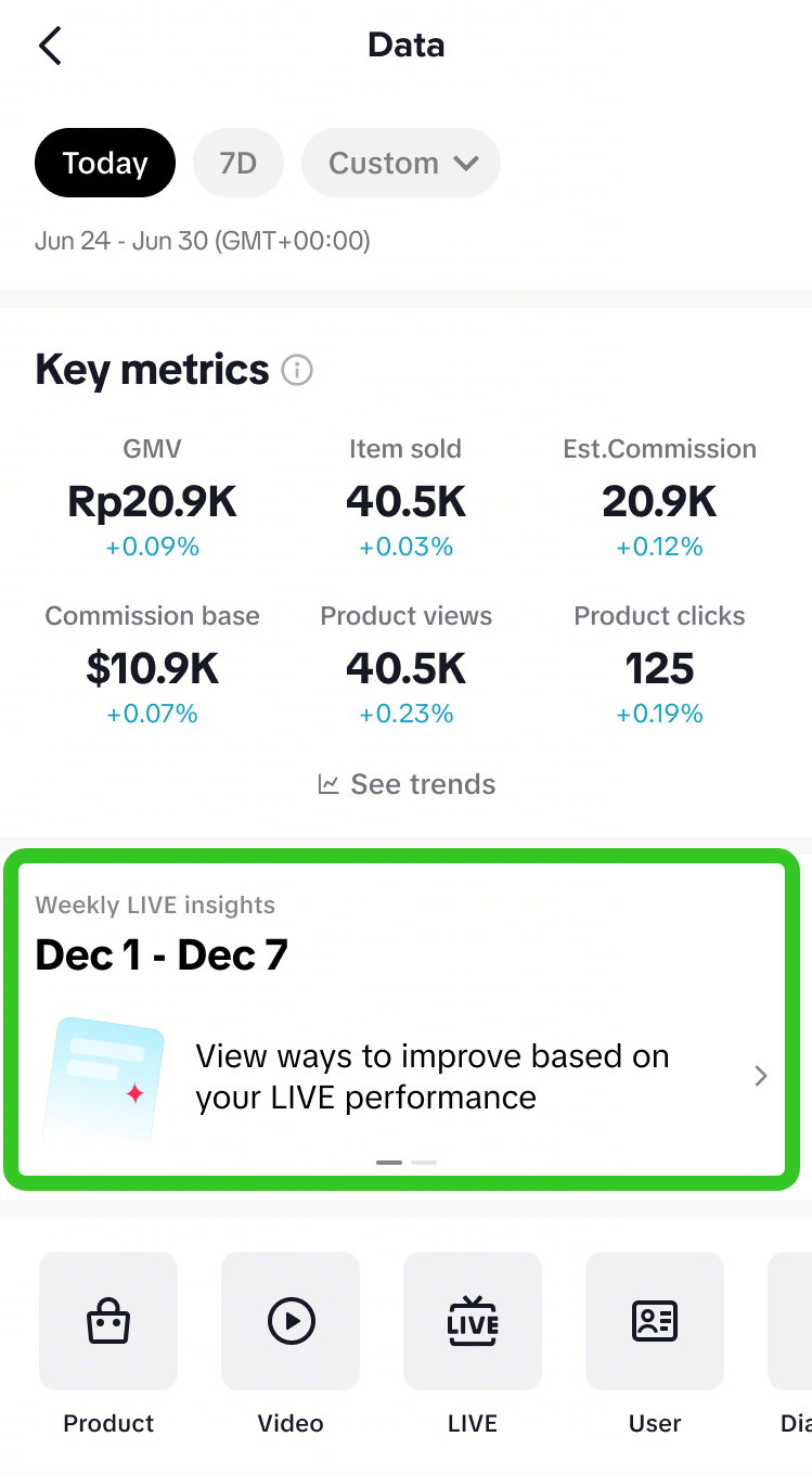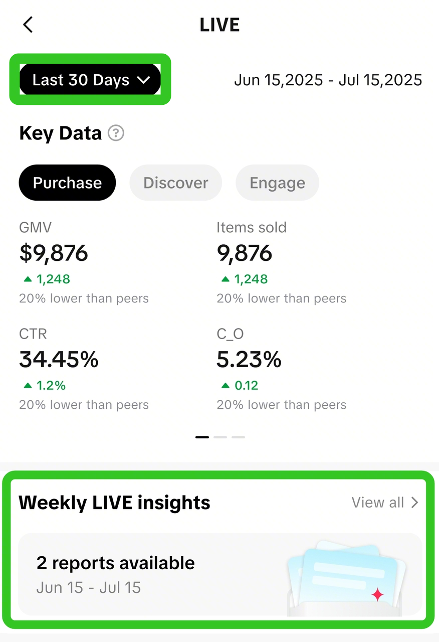 所有商家及联盟达人均可使用周直播数据分析功能,该功能会自动生成每周报告,由此可以查看: