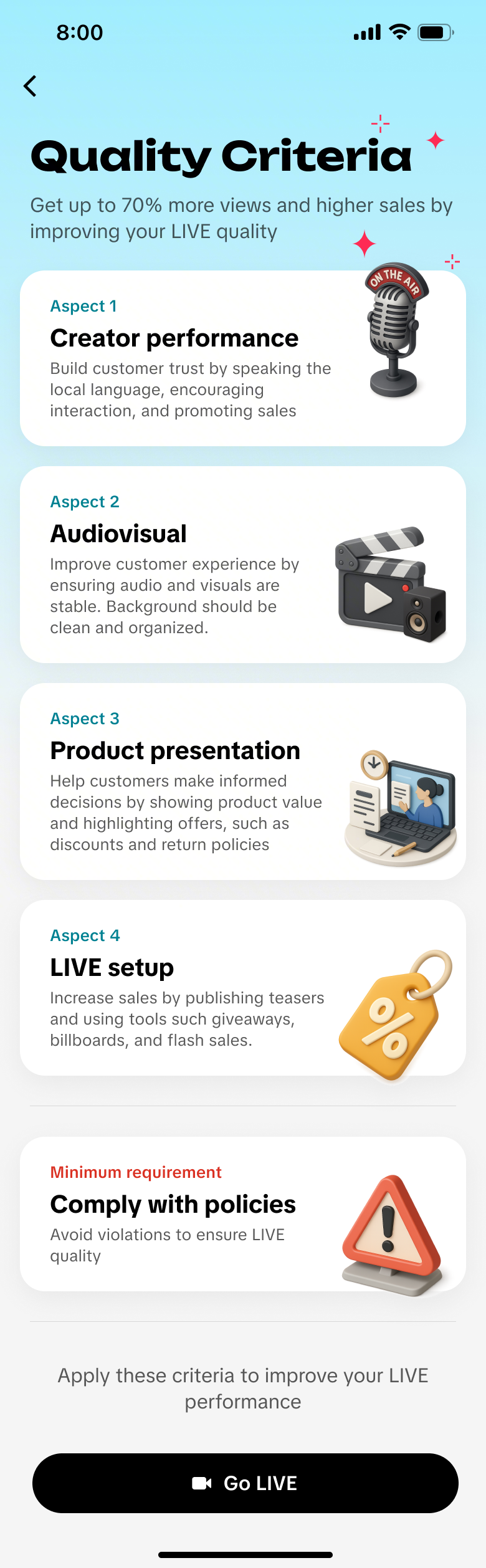 | | | 1. 了解打造高质量直播的质量标准 – 点击“查看标准”,即可了解四大核心质量标准:达人表现、音视频、商品展示、直播设置。 |